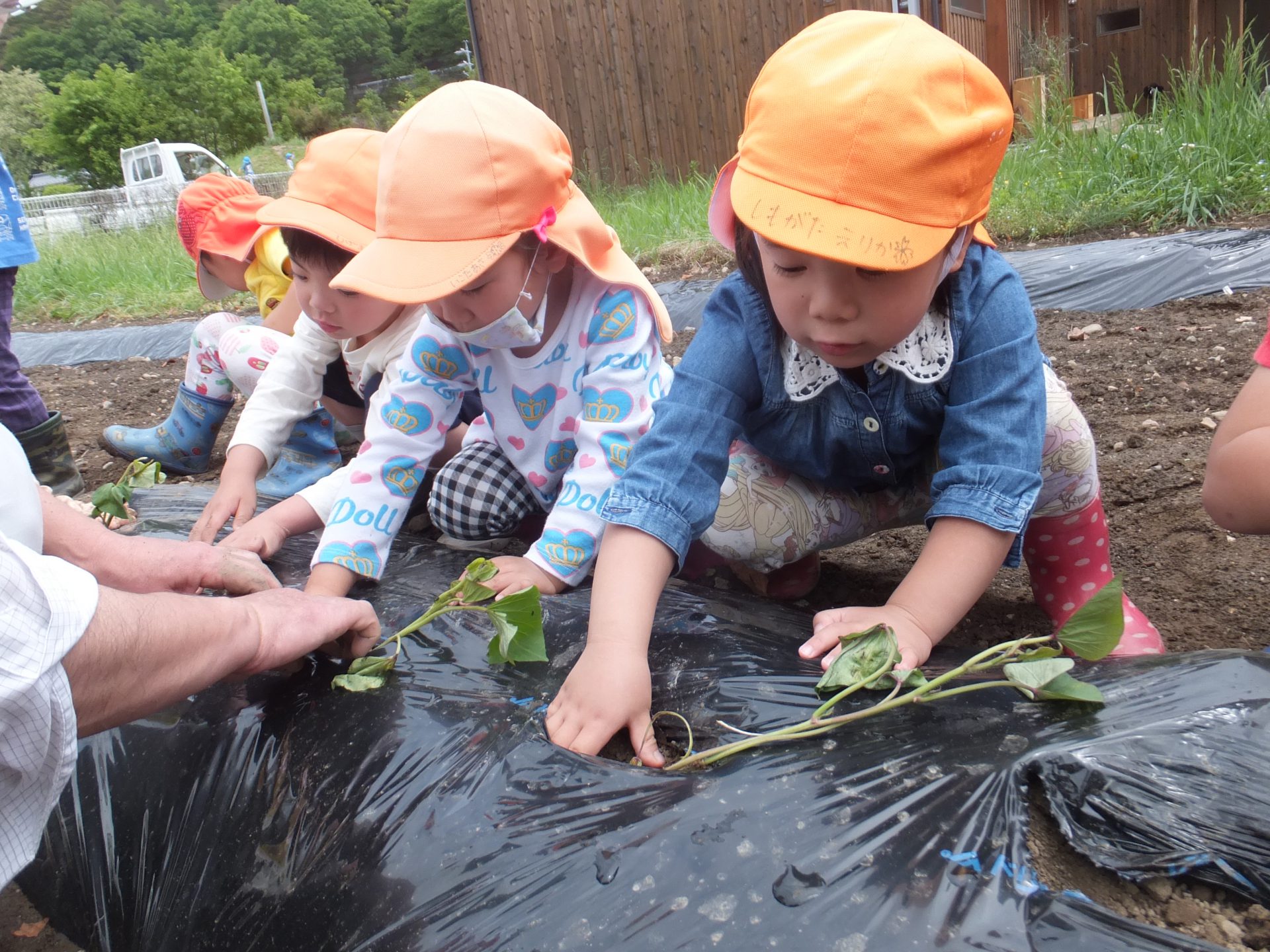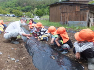園長先生に苗の植え方を教えてもらいながら、自分たちもやってみました。