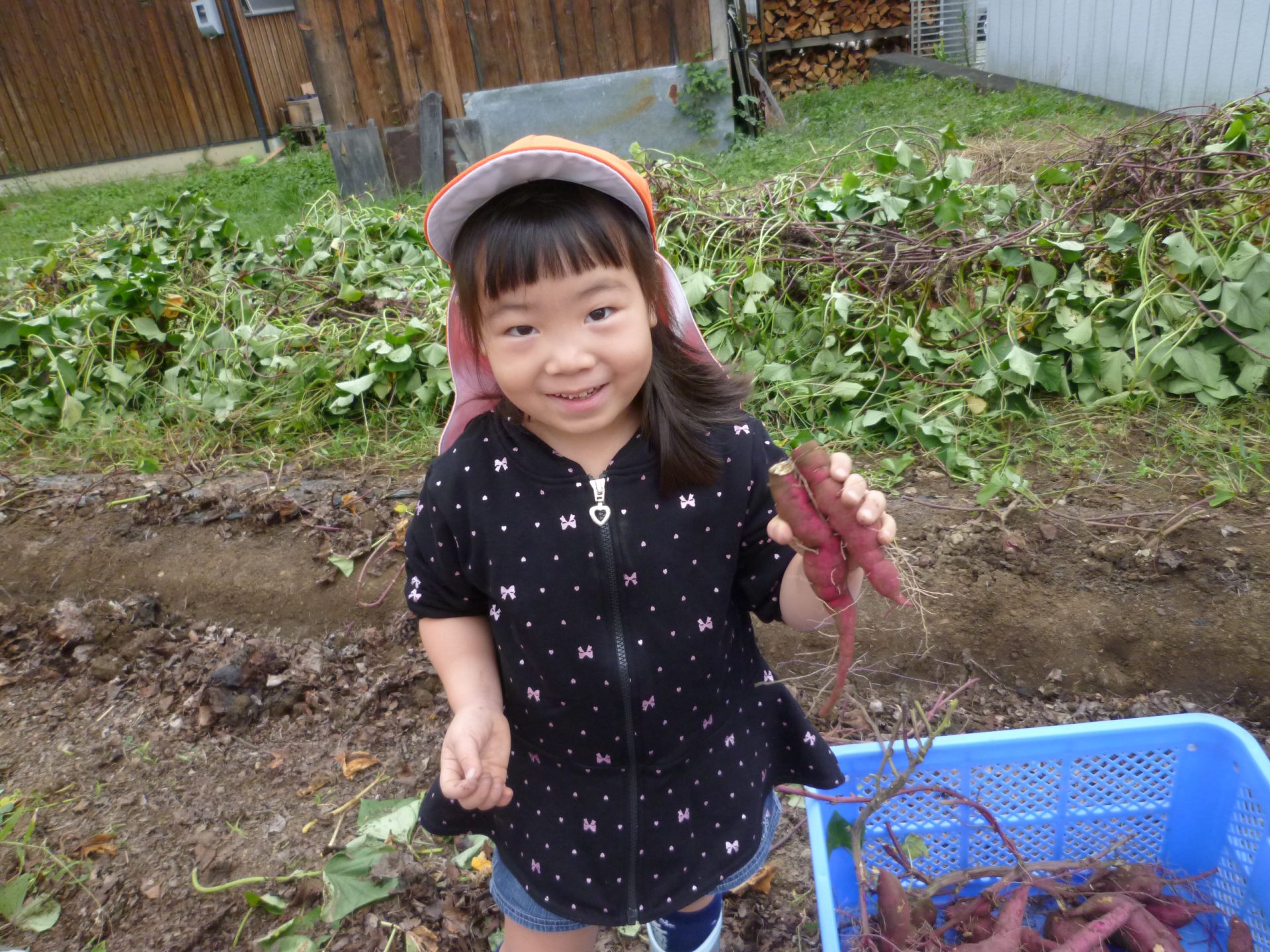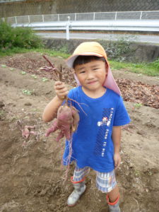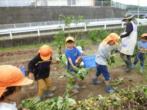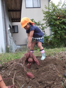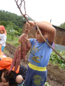 収穫時は、土が硬くなかなか掘り起こせずに苦戦していましたが、この大変さも採れた時の感動や食べることへの期待、喜びにつながったのではないでしょうか。また、お芋の大きさや数、形にもいろいろな発見があり、収穫を通して数々の学びを得られる活動ともなりました。これからも、子どもたちには自然との触れ合いを通して様々な発見をし、学びを深めていってほしいと思います。