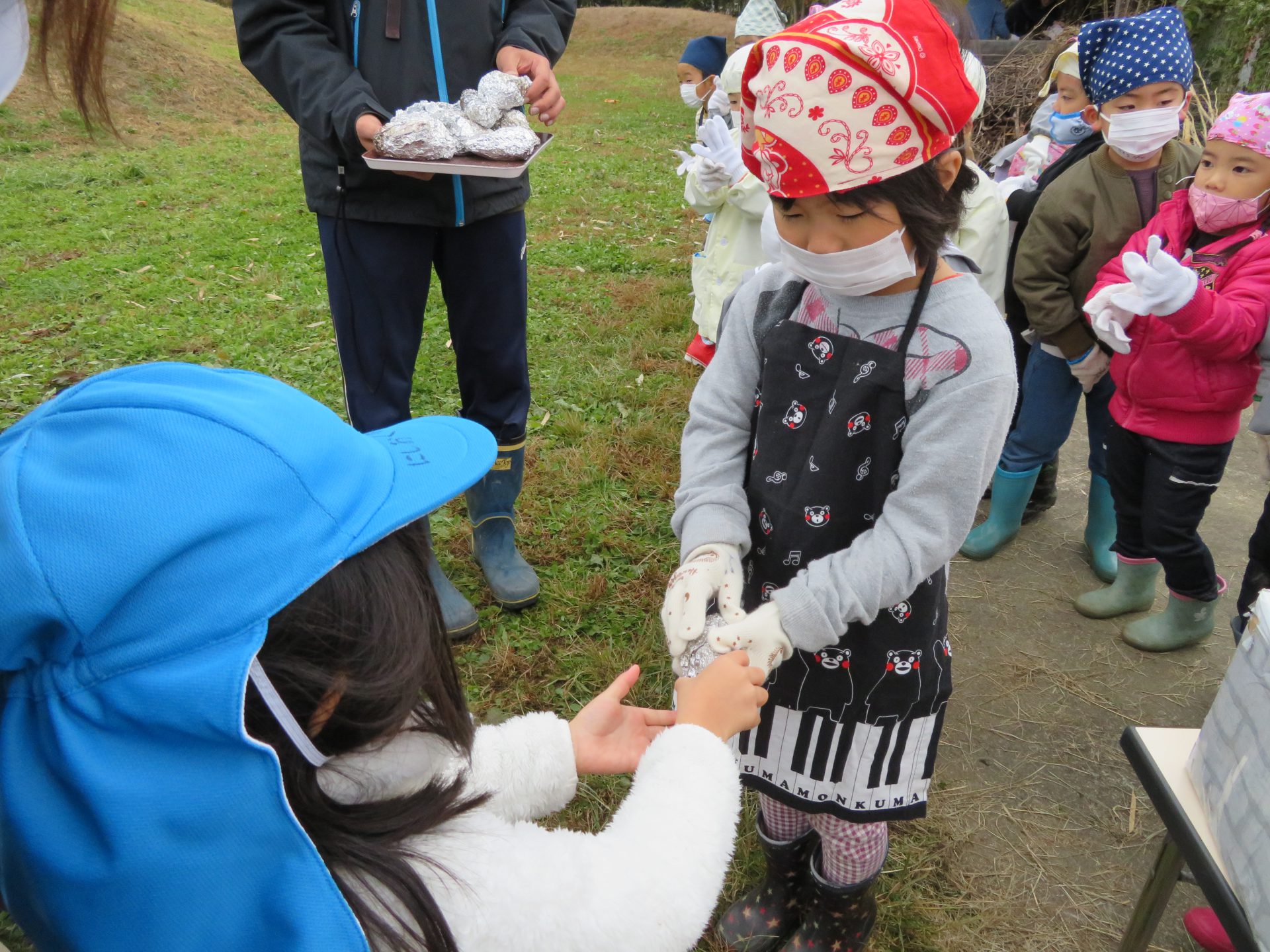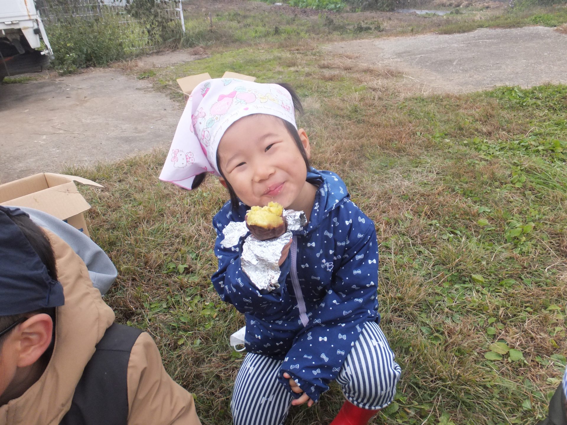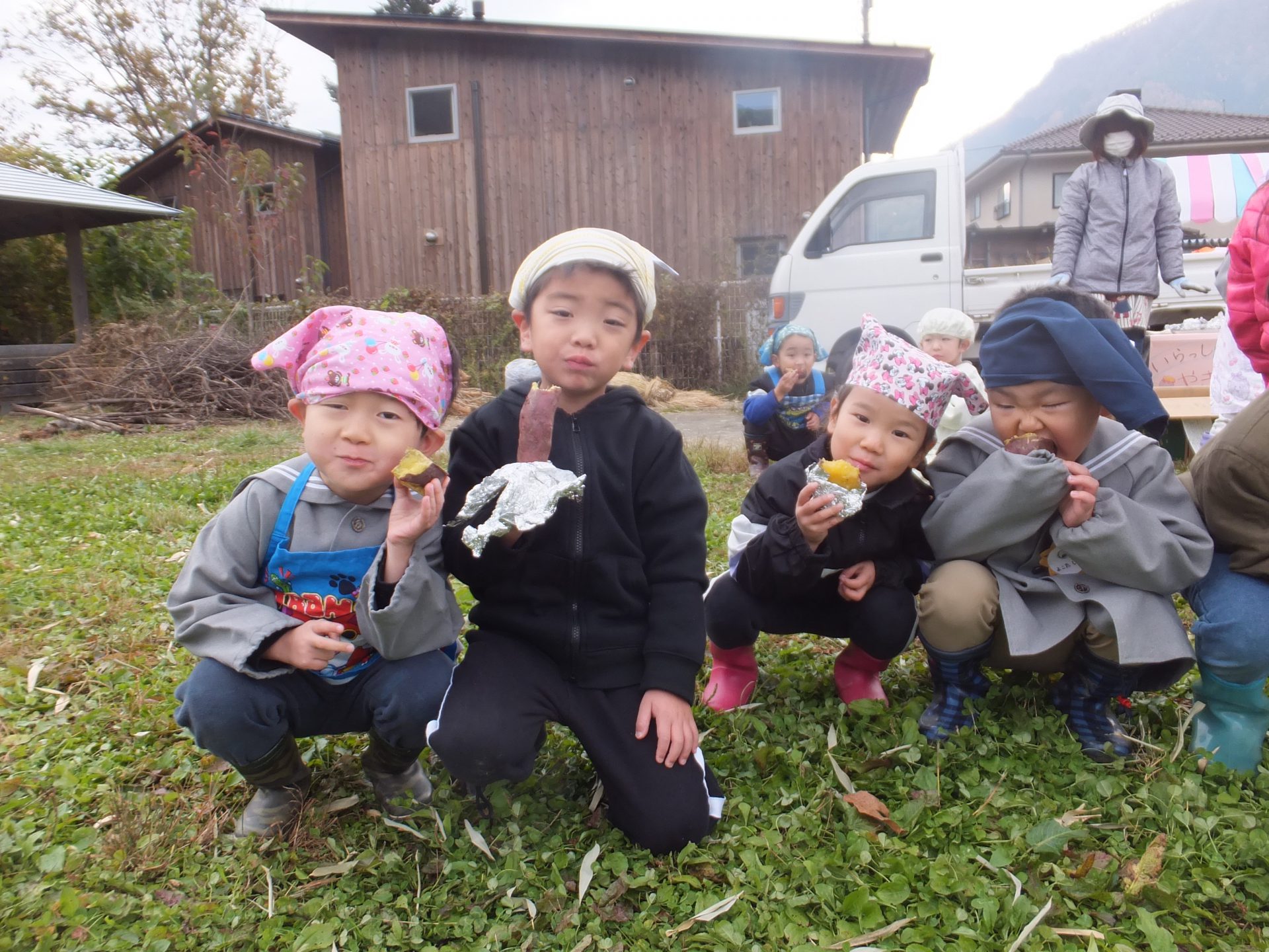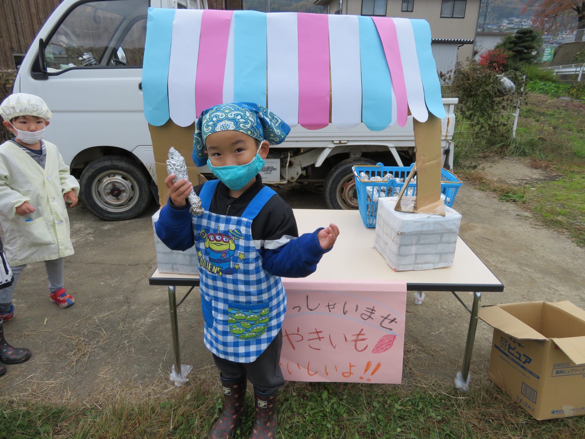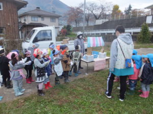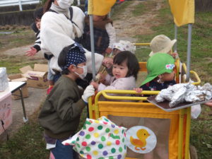 赤ちゃんからお兄さんお姉さんまで、みんなで作った焼き芋を配りすっかり気分は焼き芋屋さん。