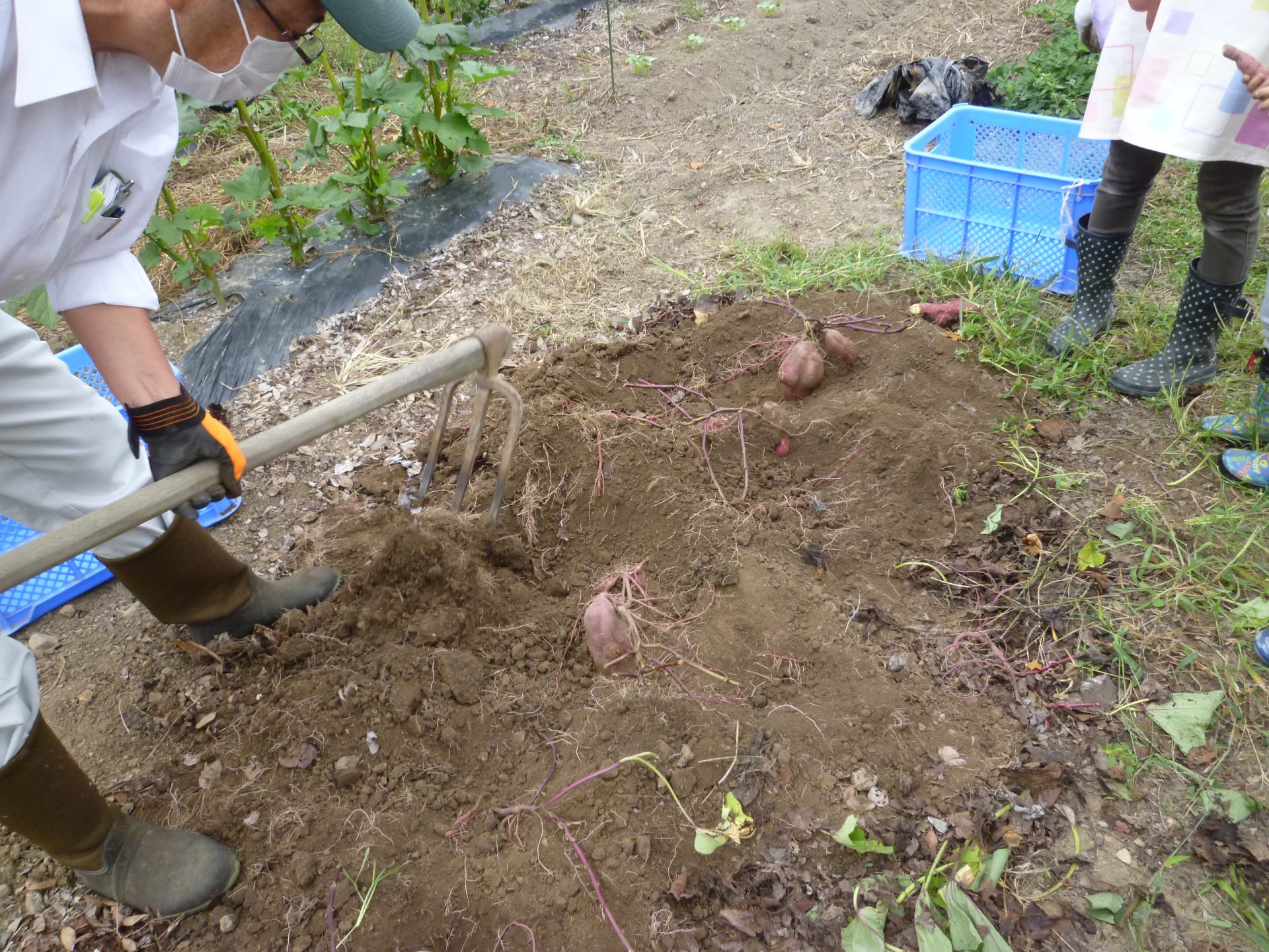 「せんせい、掘れないー。」「土がかたーい。」「おいも折れちゃった。」