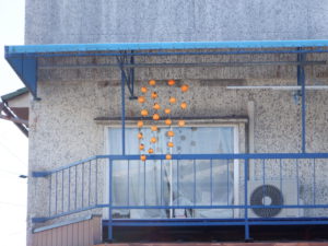 「あっ!柿だ。」園の近所のお宅でも干し柿ように柿をつるしてありました。子ども達もよく知っています。