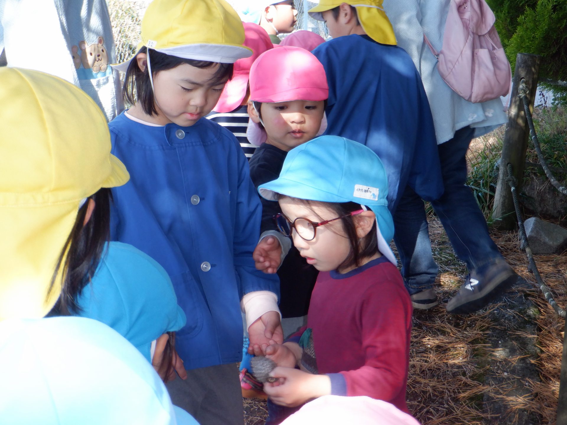 途中で見つけたまつぼっくり「ねぇ、このまつぼっくり触るとチクチクするよ。」