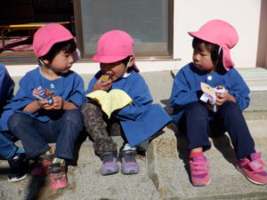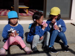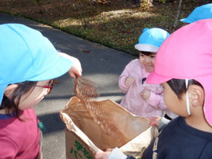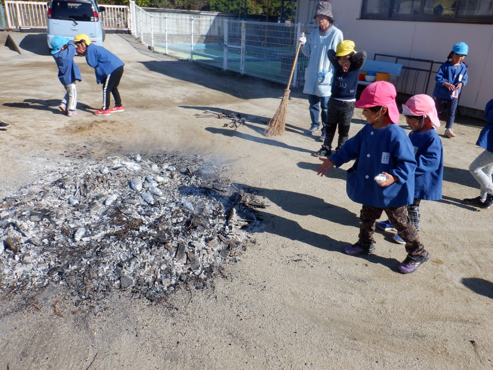 焼けたお芋をその場でいただきます。「熱いね。」「甘いよ。」「おいしいね。」皆うれしそうです。