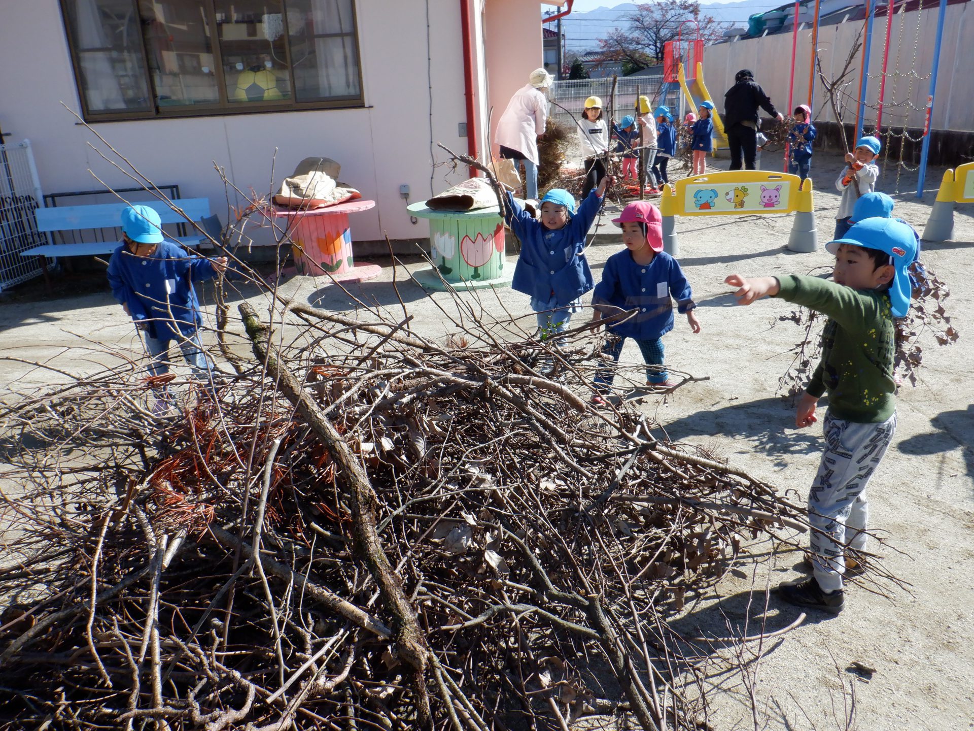 園庭に広げたら、こんなに大きな焚き木の山ができました。