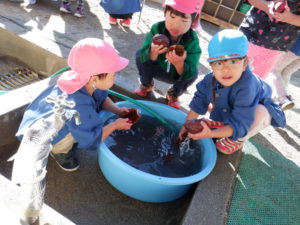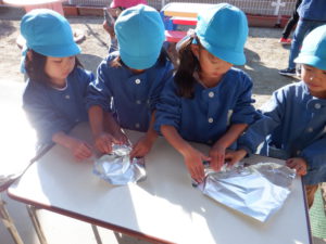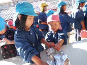 当日も朝早くから冷たい水に手を入れてお芋を洗って準備をし、ホイルがうまく包めない子には周りの友だちが教える姿も見られました。