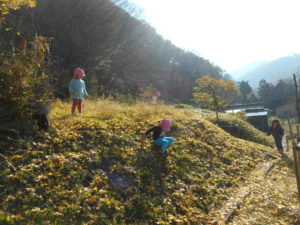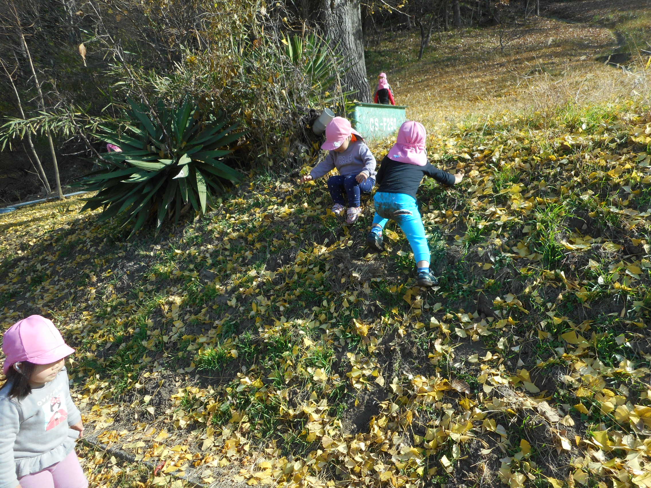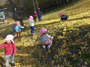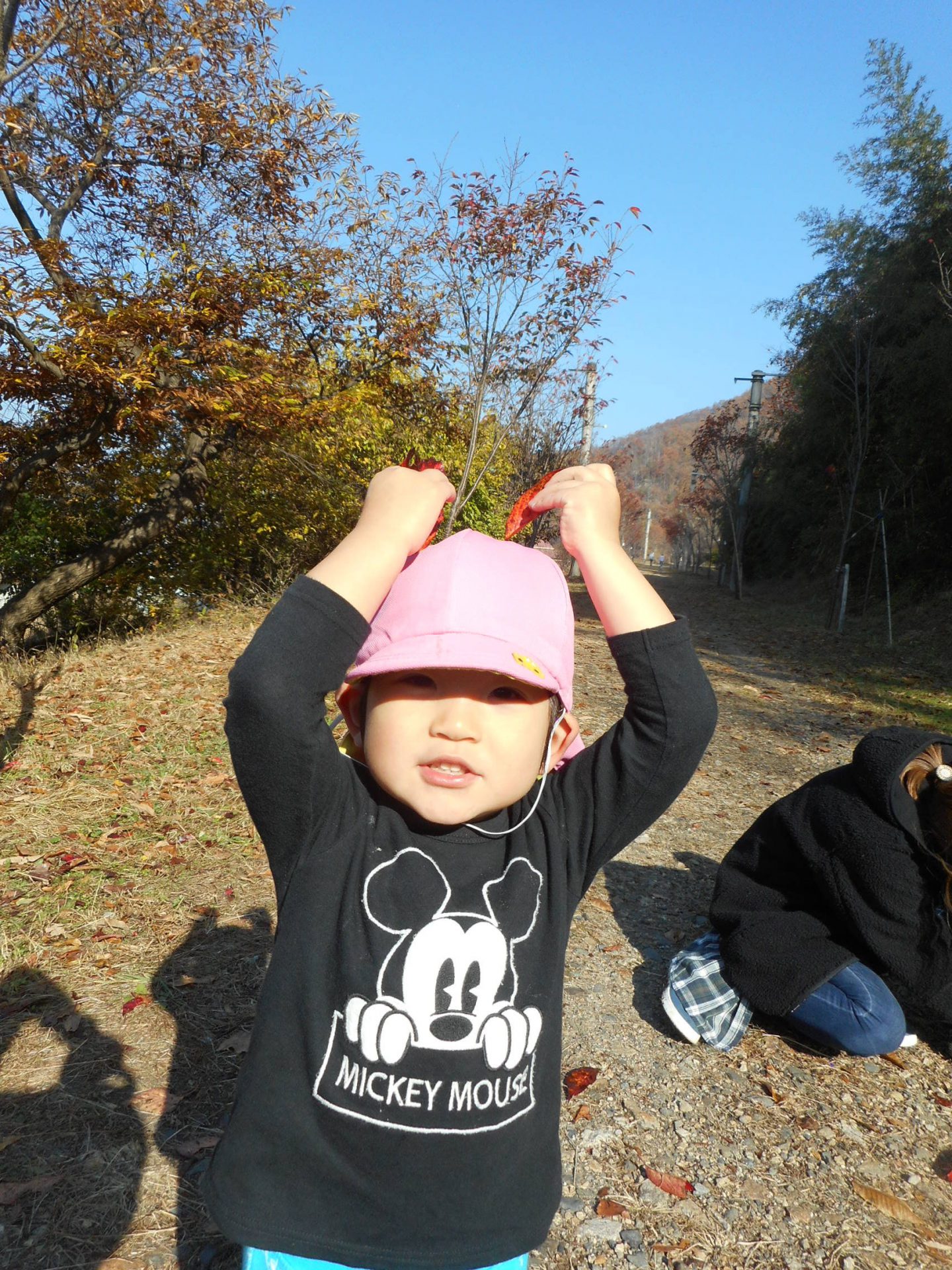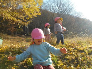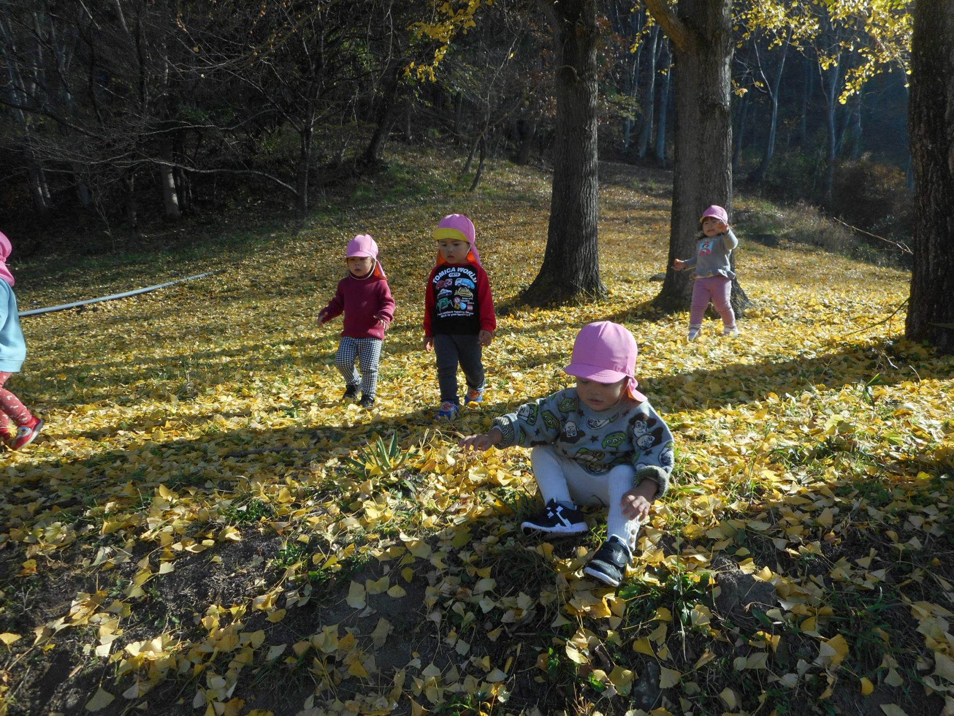 歩くたびに、カサコソと音を立てる落ち葉を踏みながら遊びます。