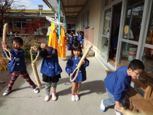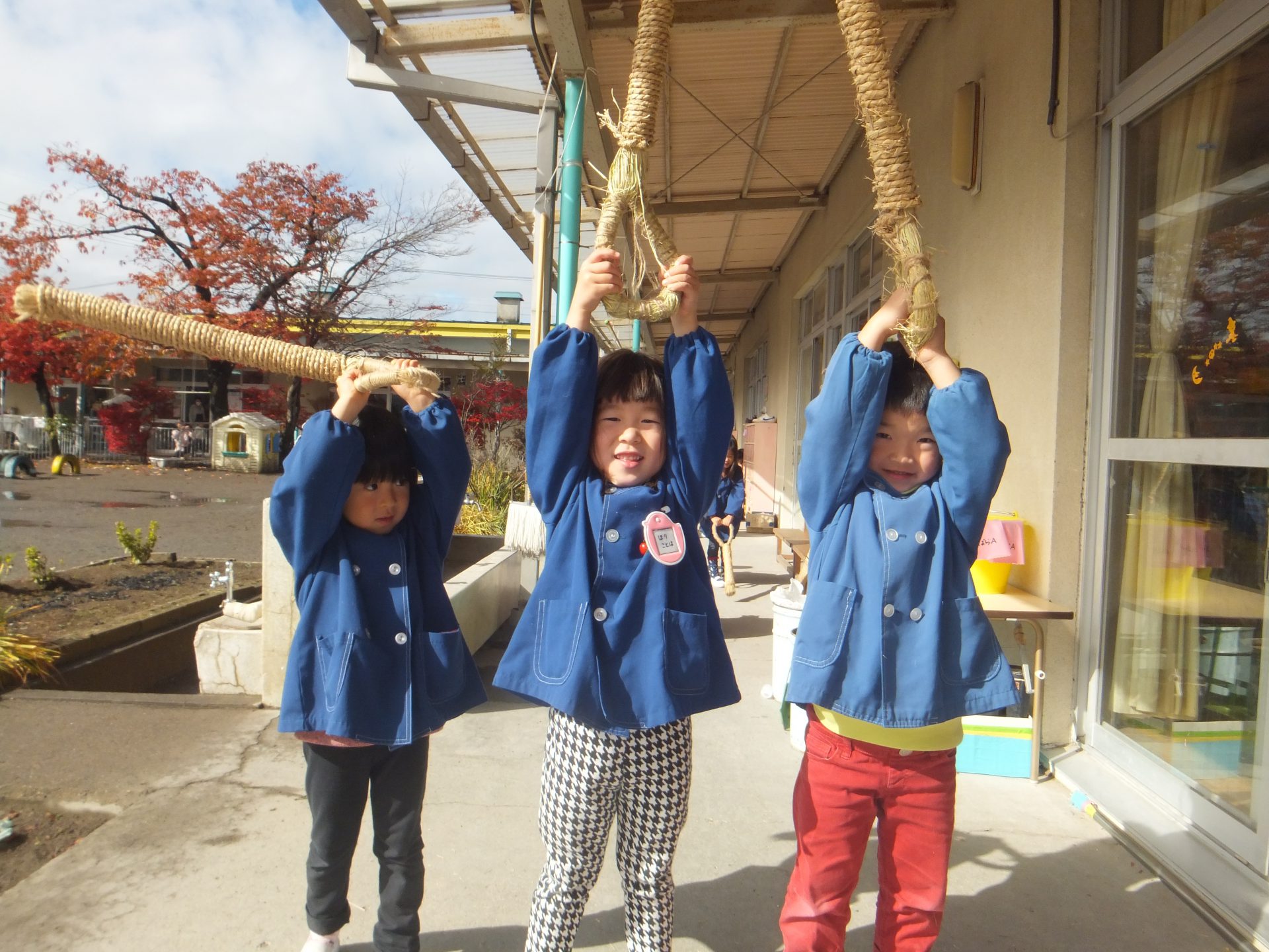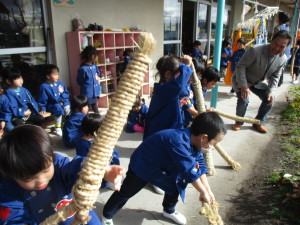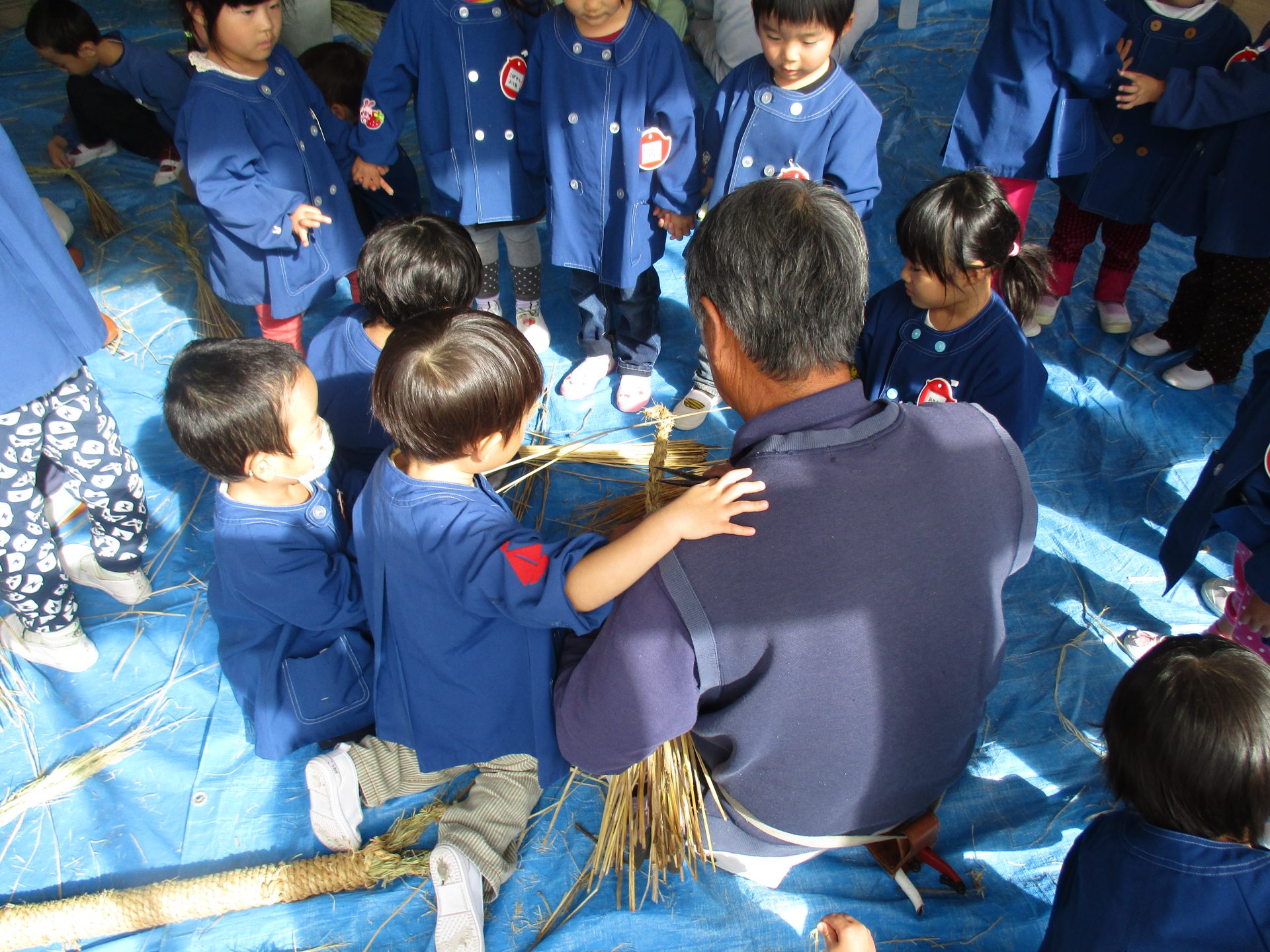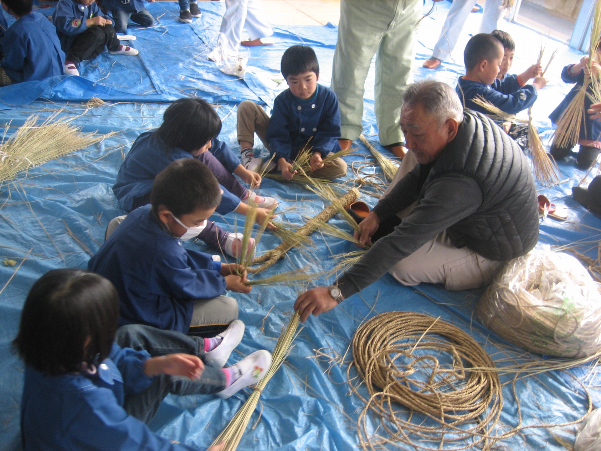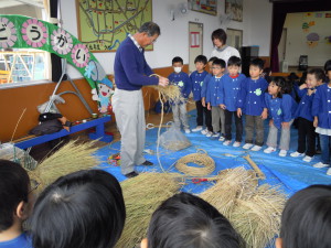 年長児は、実際に藁に触れ地域の方とともにしめ縄づくりの体験も行いました。