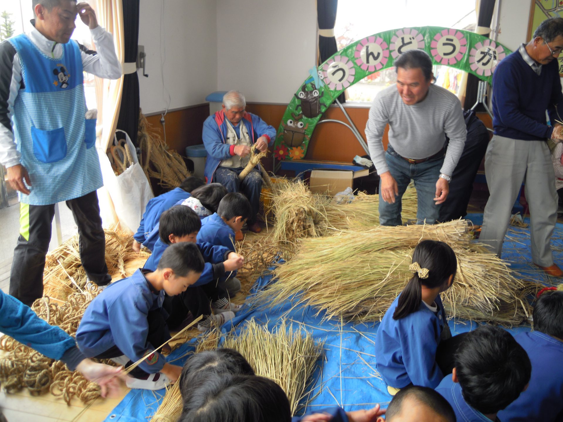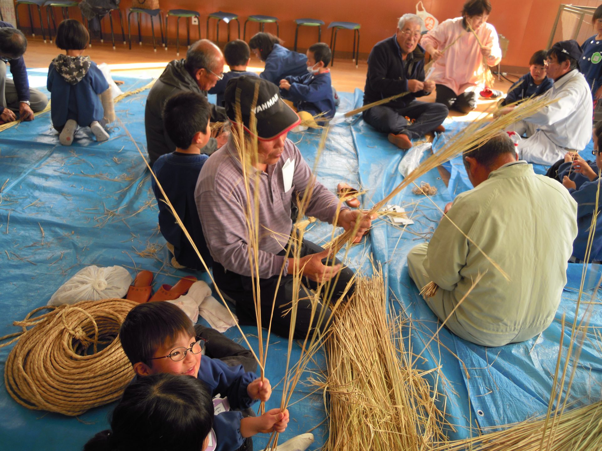 みんなで地域の方に「十日夜のわらでっぽう」の由来をお聞きしたり、「わらでっぽうづくり」や「しめ縄づくり」をするところを見せてもらいました。