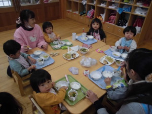 給食時に「いただきま~す!」 0・1歳児クラスの子どもたちもおいしそうに食べています。