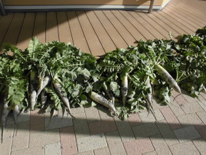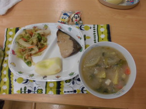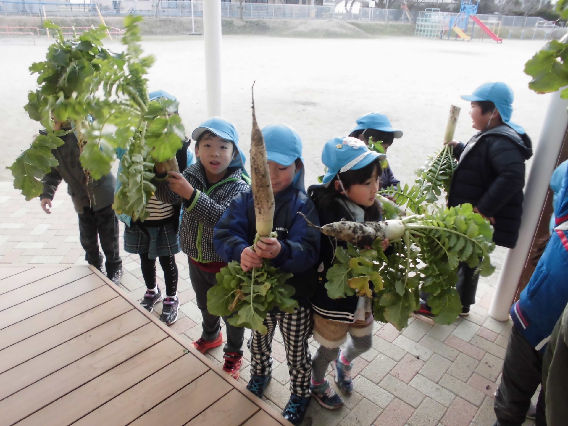 みんなで相談して 園の畑で収穫したさつまいも・白菜・大根を給食に入れていただき