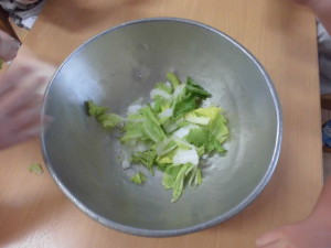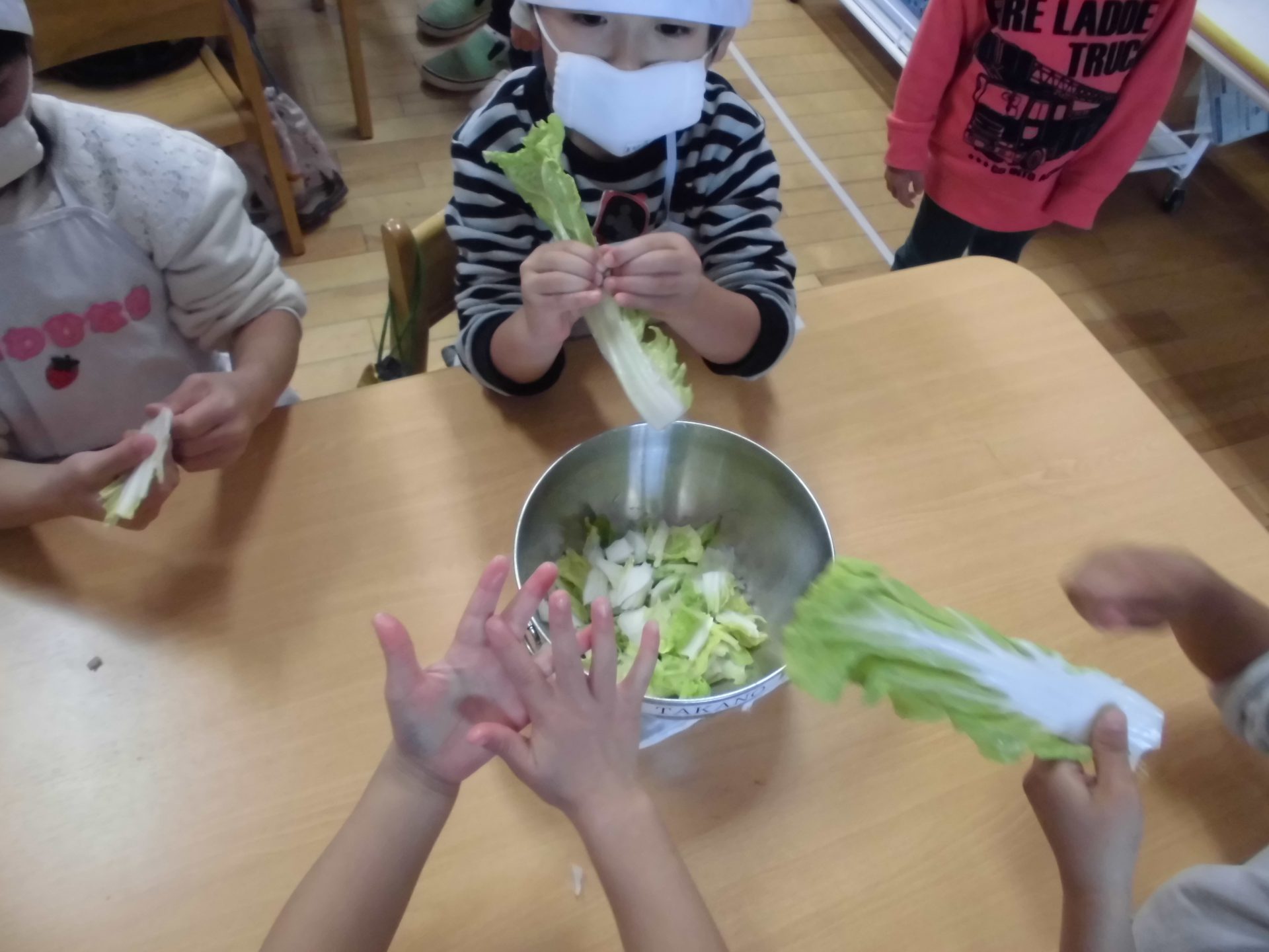 大きいクラスの子どもたちが、野菜の準備を手伝います。