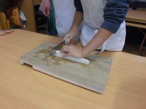 「僕たちは包丁を使って 大根をいちょう切りにするよ。」(年長)