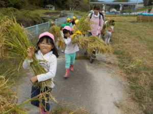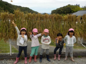 「今年も大収穫~‼ やったね~!」 年長さん、稲刈りお疲れ様でした。