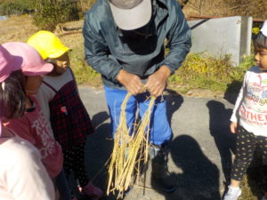 「脱穀が済んだワラで、お正月のしめ縄ができるんだよ。」