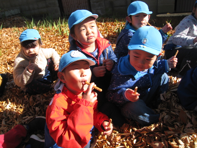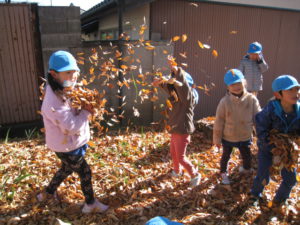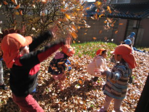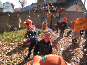 ・秋ならではの自然遊びを楽しむ中で、枯葉を踏んだ時の感触や音などに気づき、五感で”秋”を感じてほしい。