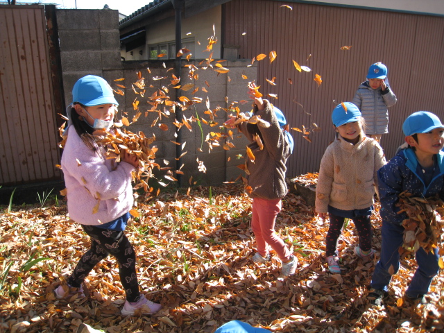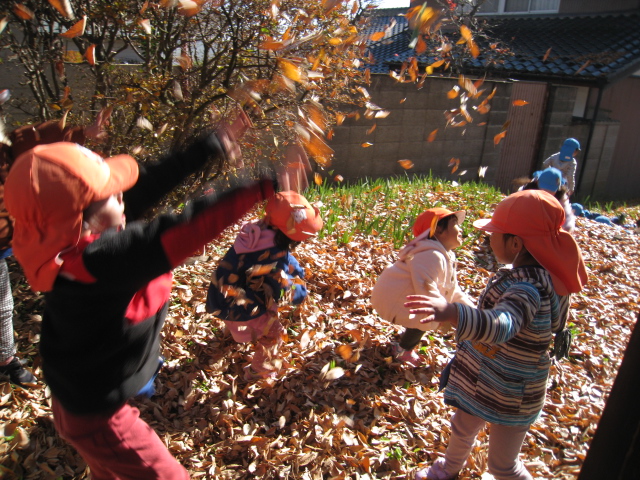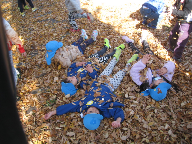 落ち葉のシャワーをかけたり、落ち葉のベットに寝転がったり。