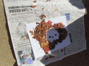 おや、落ち葉をかまっていたら、こなごなになっちゃった。う〜ん。。。