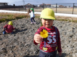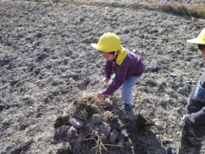稲刈り後の田んぼは園周辺でいつも見ている風景ですが、入って遊ぶことはほとんどありませんでした。秋の田んぼを耕すことが終わった後、実際に田んぼに入って土やそこにある草花などに触れることで子ども達の想像力が膨らみ、遊ぶことができました。
