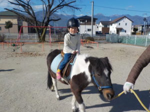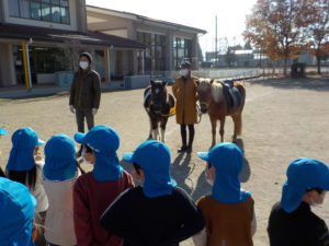 馬がびっくりしないように大きな声を出さないこと、走り回らないこと、みんなの安全のために馬の後ろには行かないことを約束し、年長さんは乗馬体験をしました。
