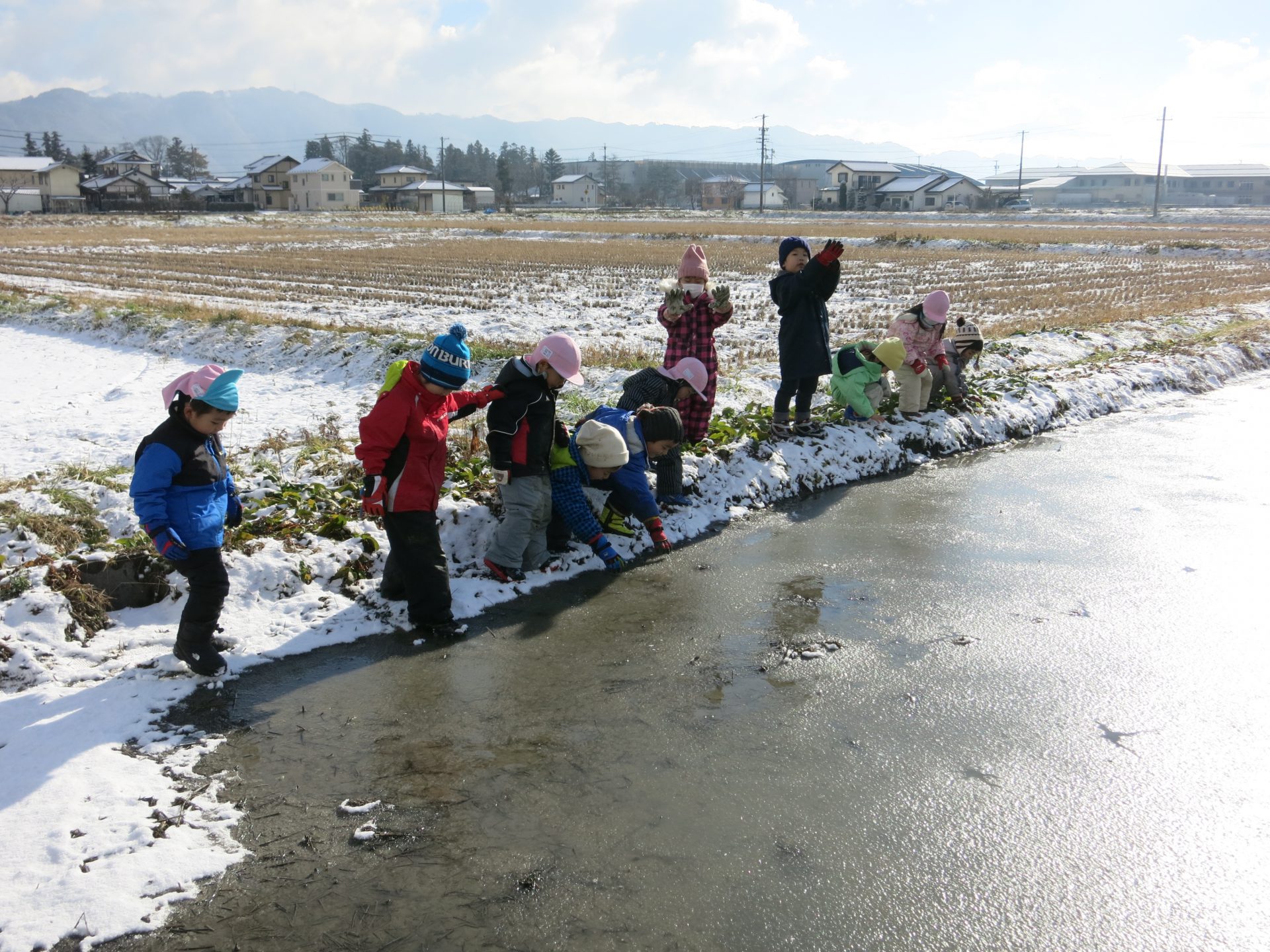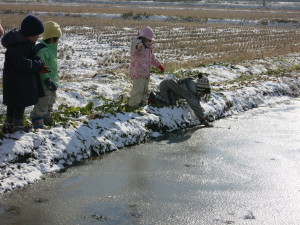 今年2度目の雪。園庭ではところ狭しと全員で雪遊びをしているところ、園の隣の田んぼの様子を見て、不思議に思った4歳児が出かけていきました。