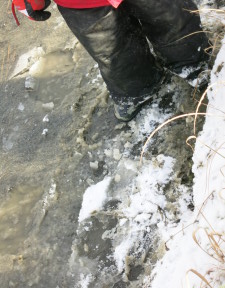 「わっ!!凍ってる。」「冷たい?」とスキーウェアが汚れるのも気にせず腹ばいになって氷を触る子ども達・・・・