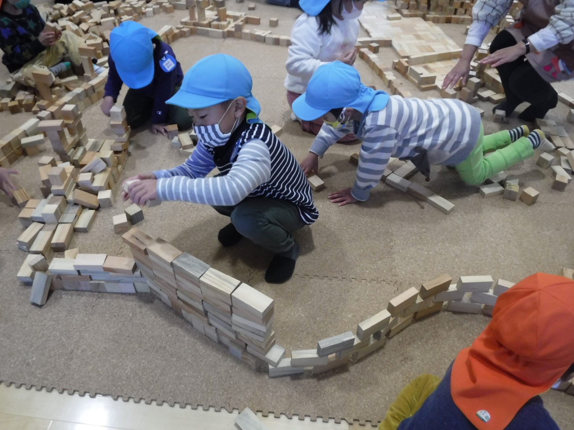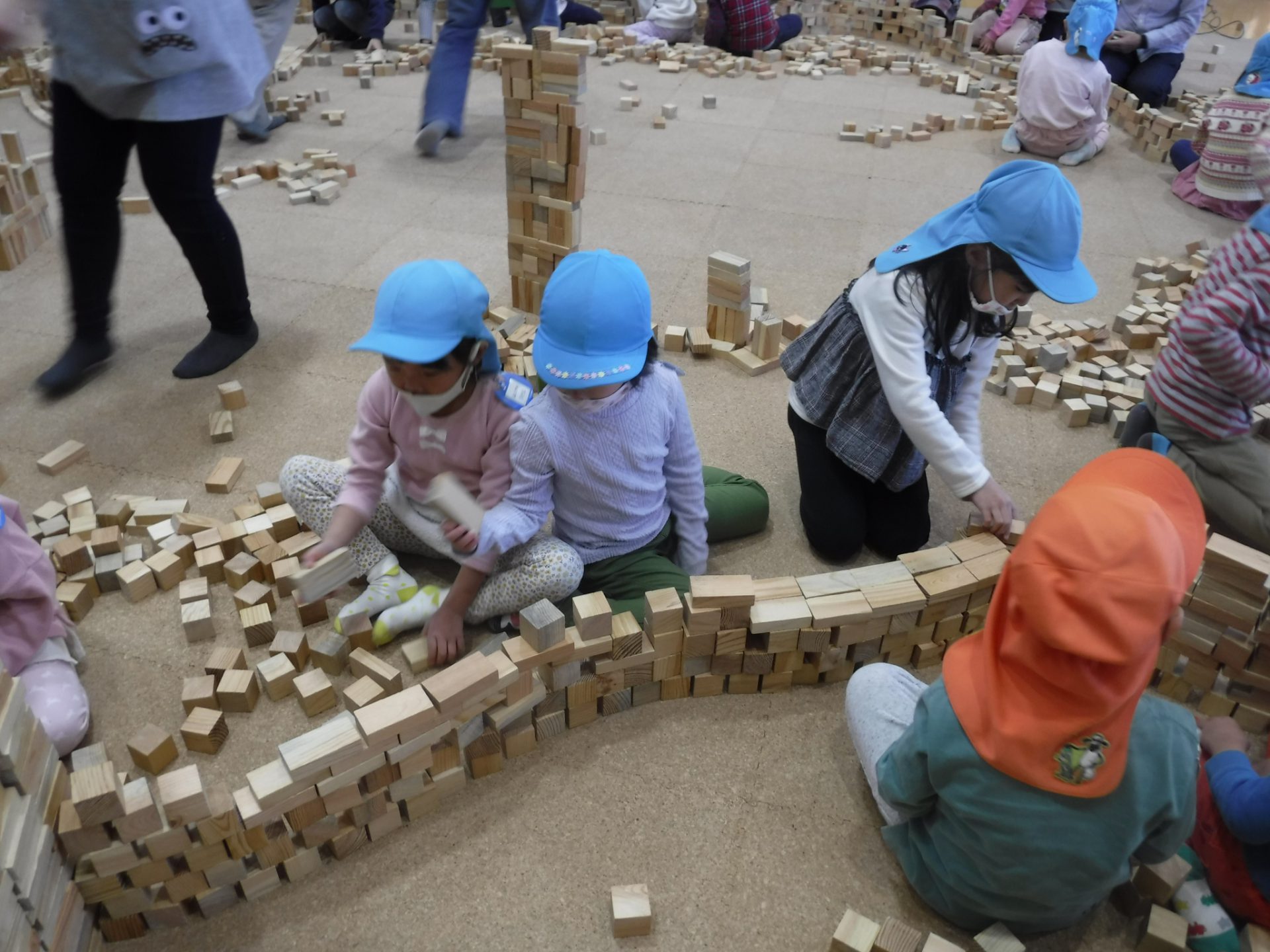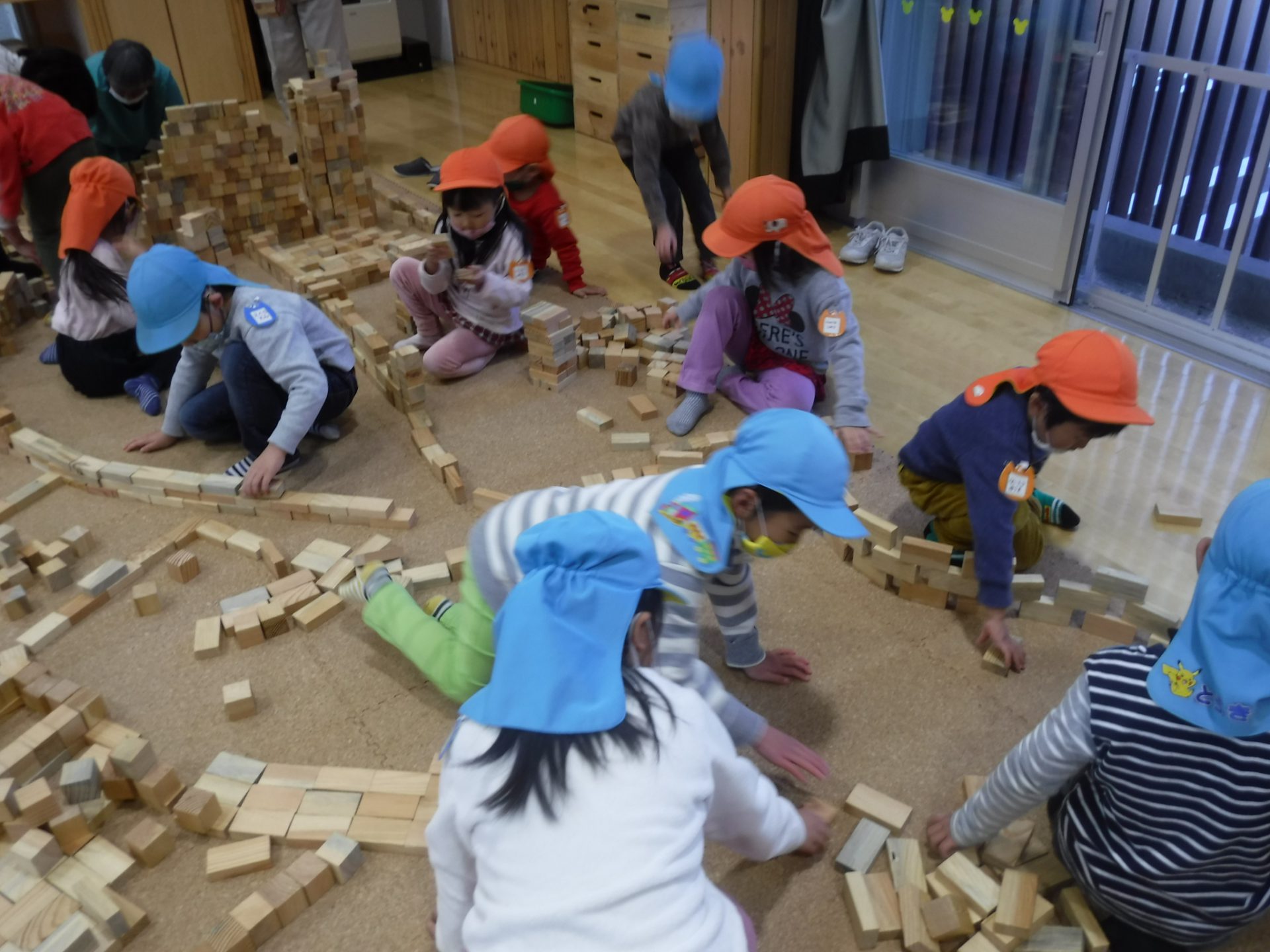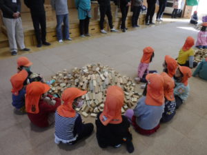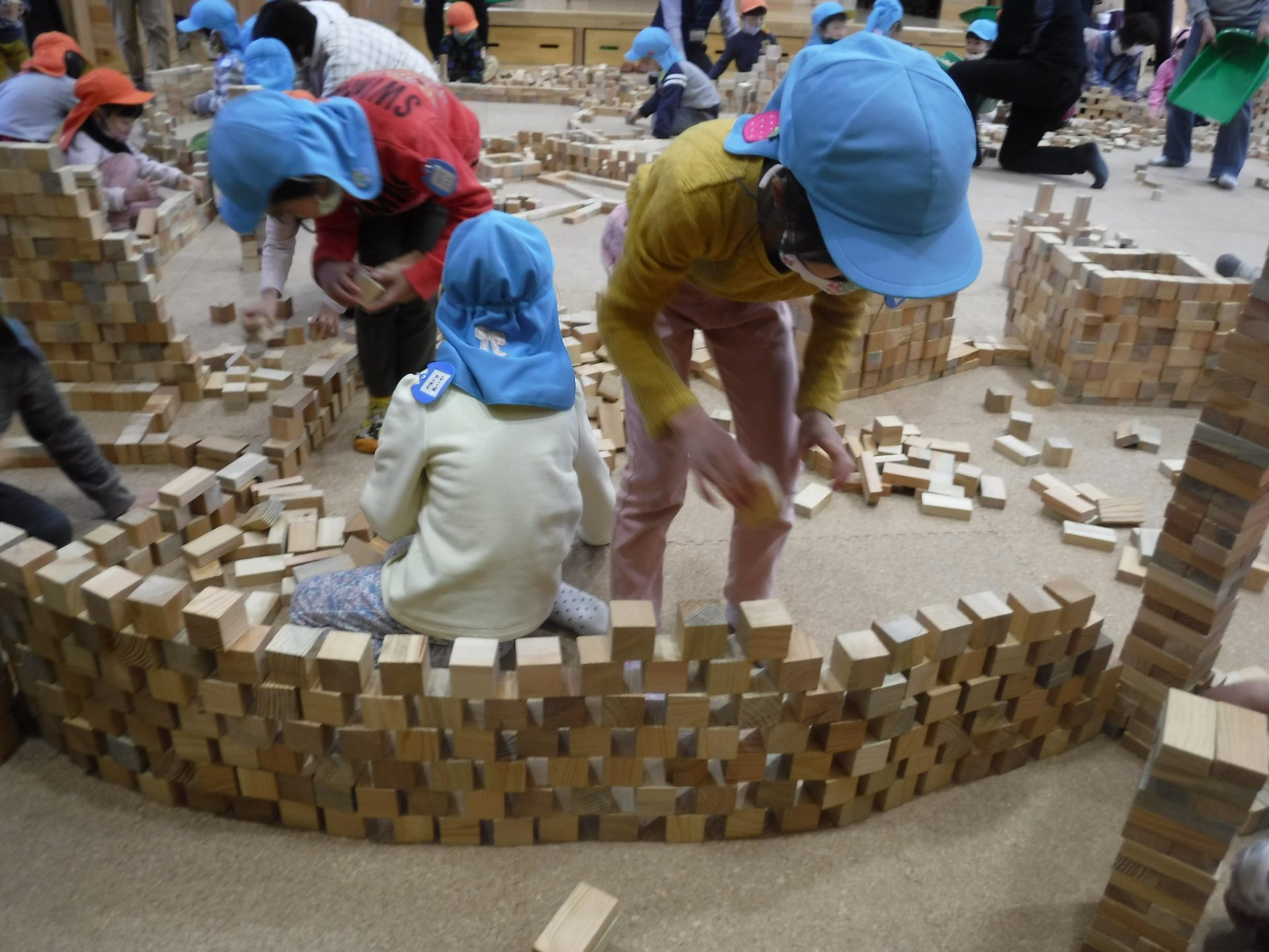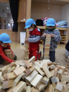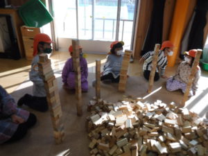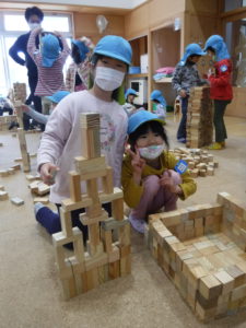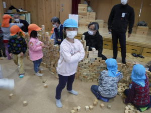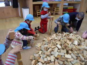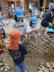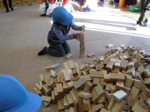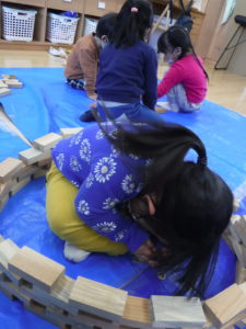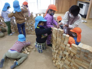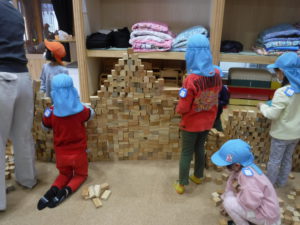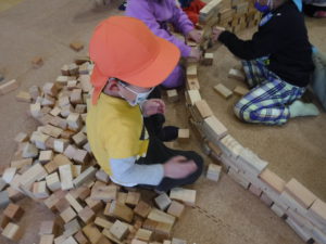 紙芝居を見た後は、みんなで協力して積み木の壁を作りました。
