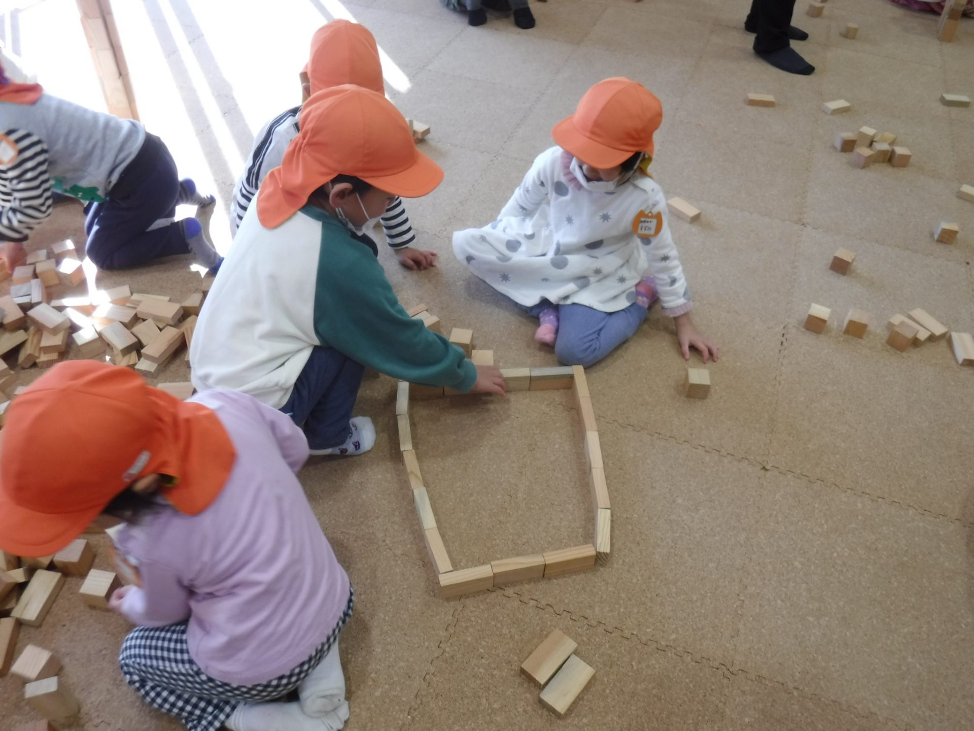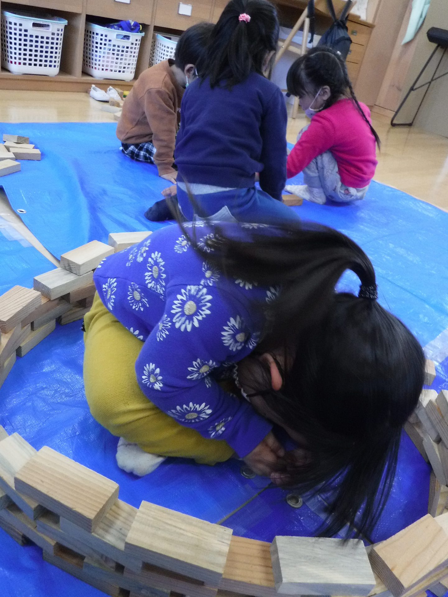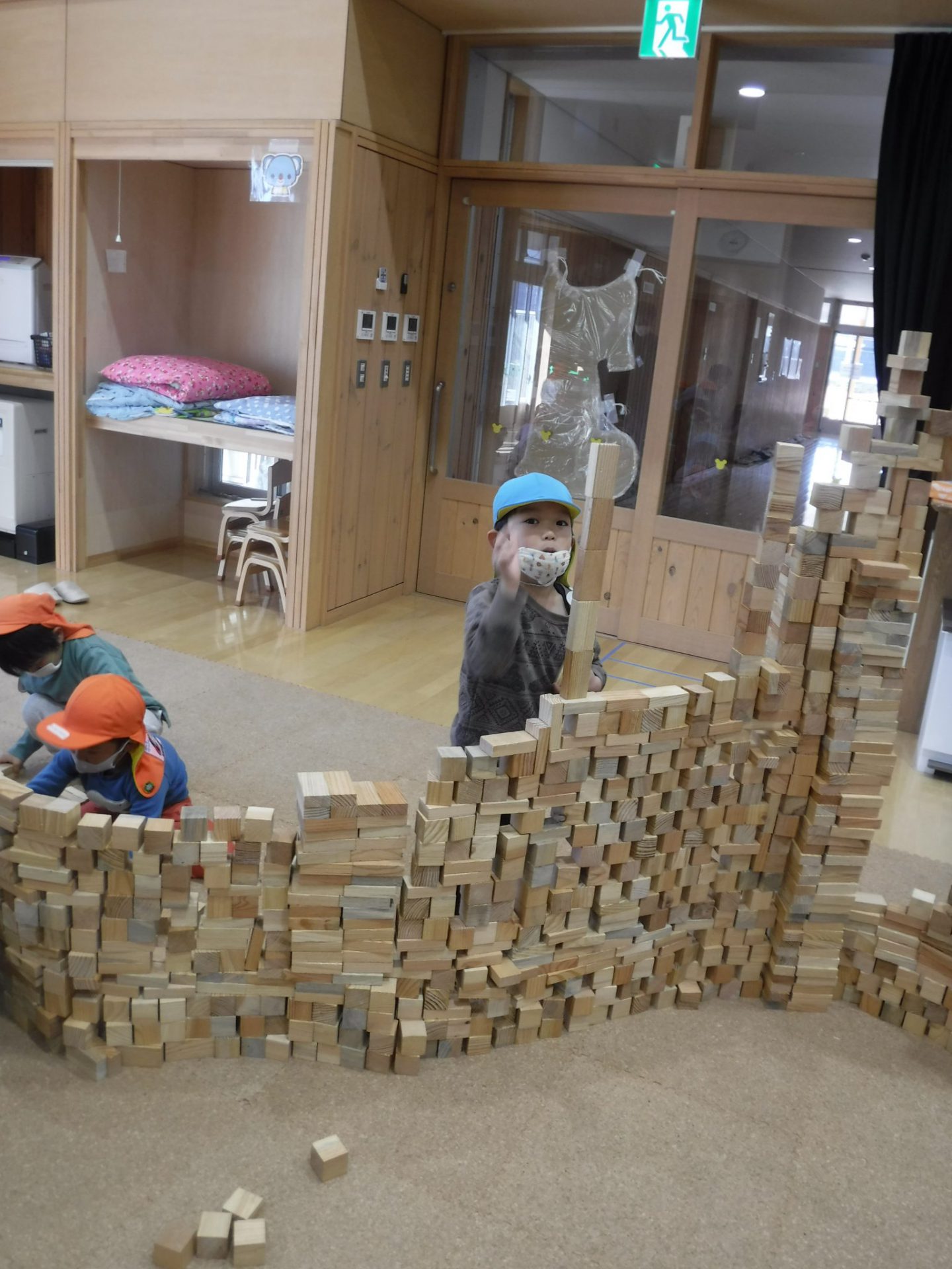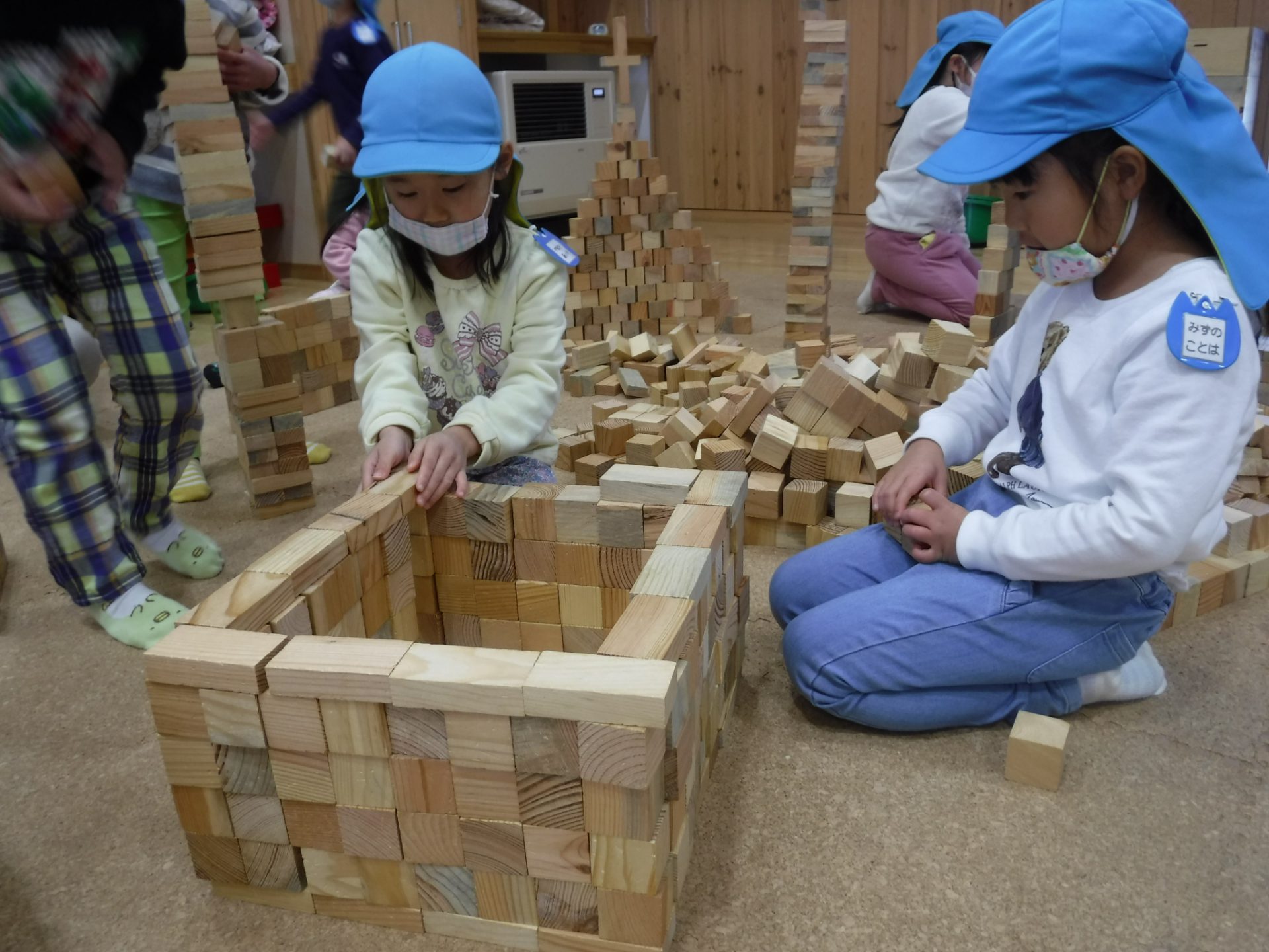 紙芝居を見た後は、みんなで協力して積み木の壁を作りました。