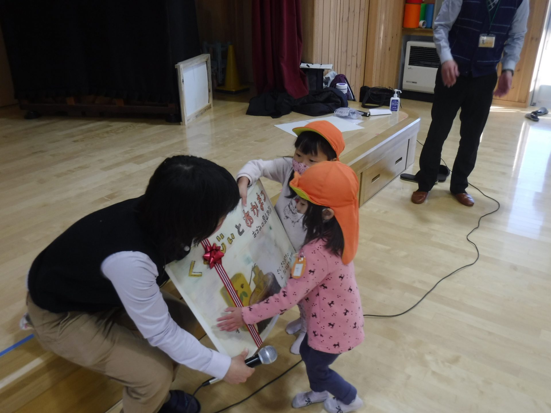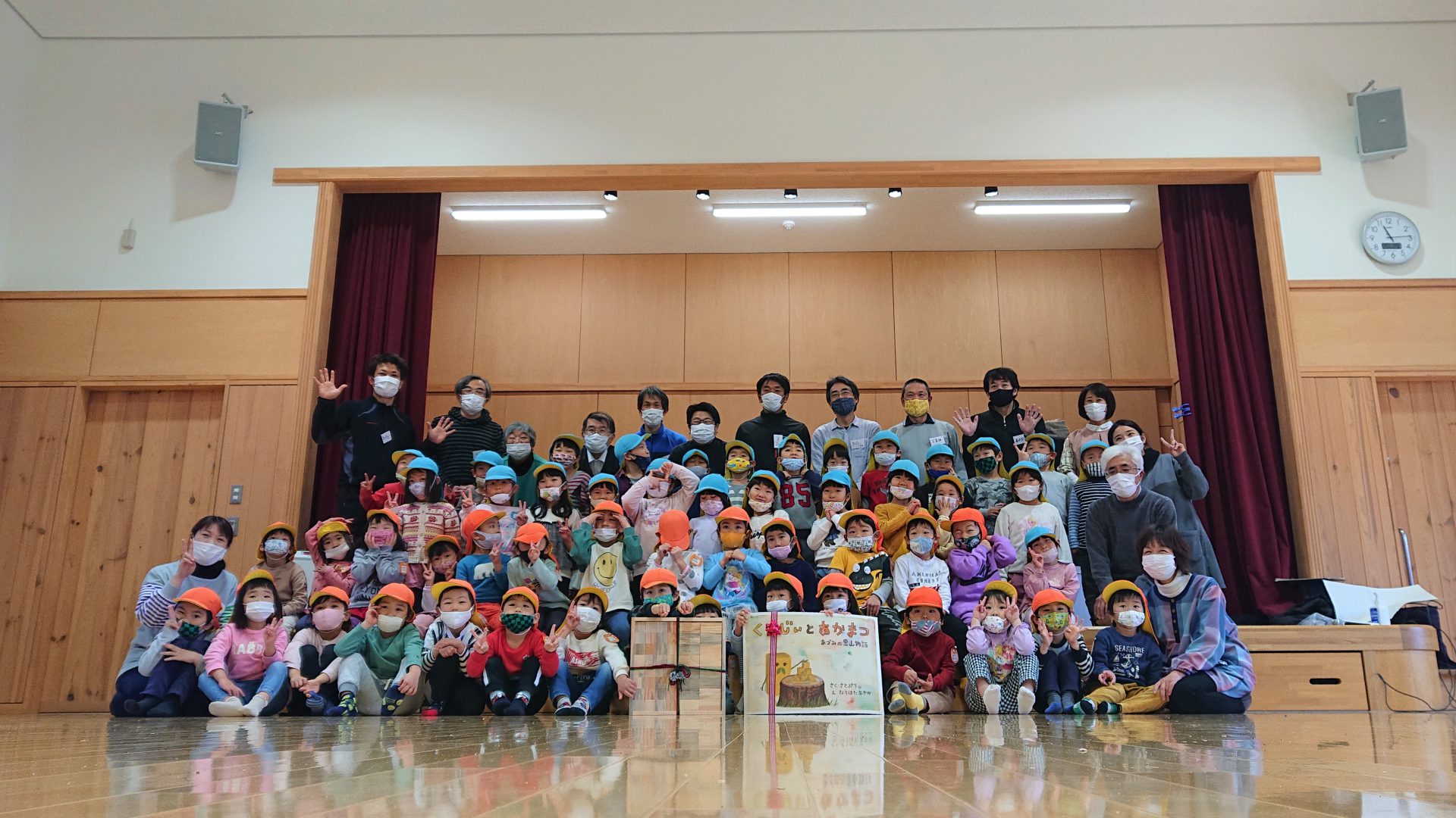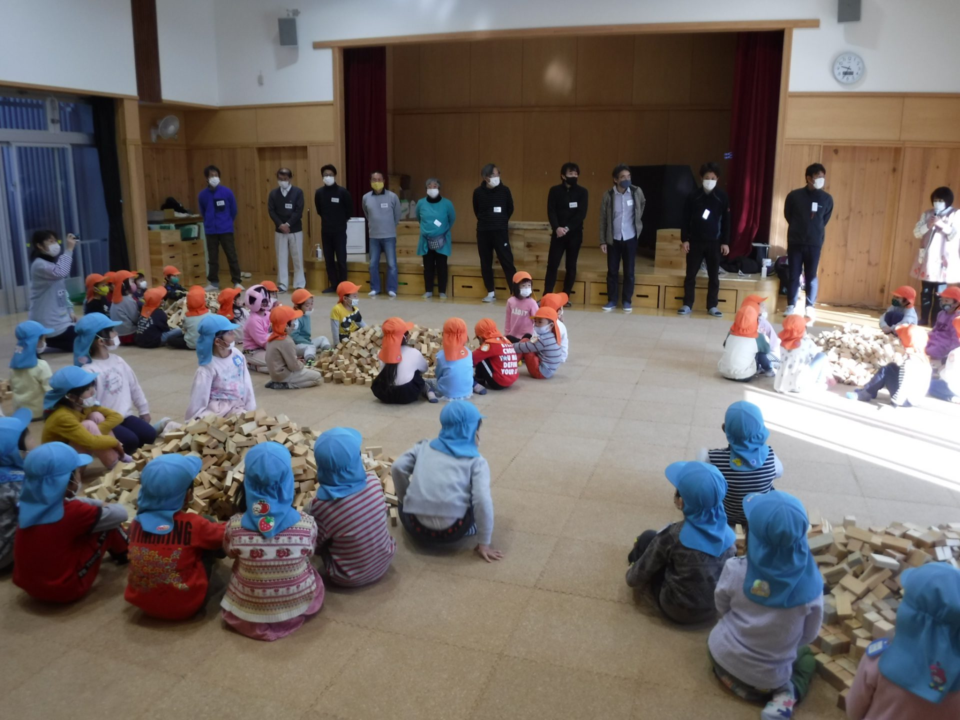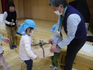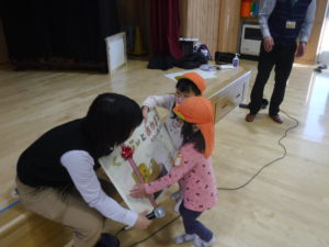 みんなで楽しんだ後は積み木キャラバン隊の皆さんから、紙芝居と積み木をプレゼントして頂