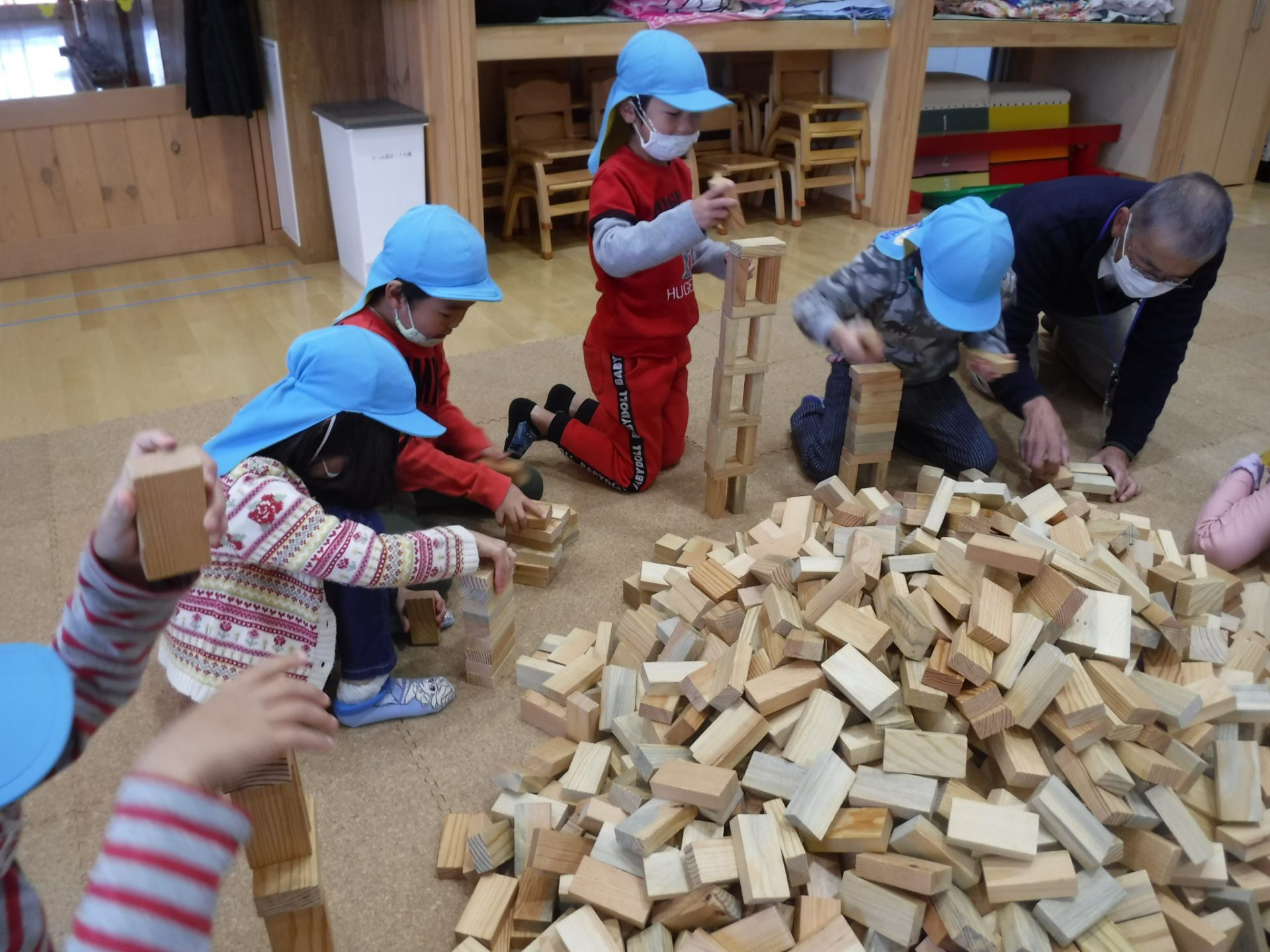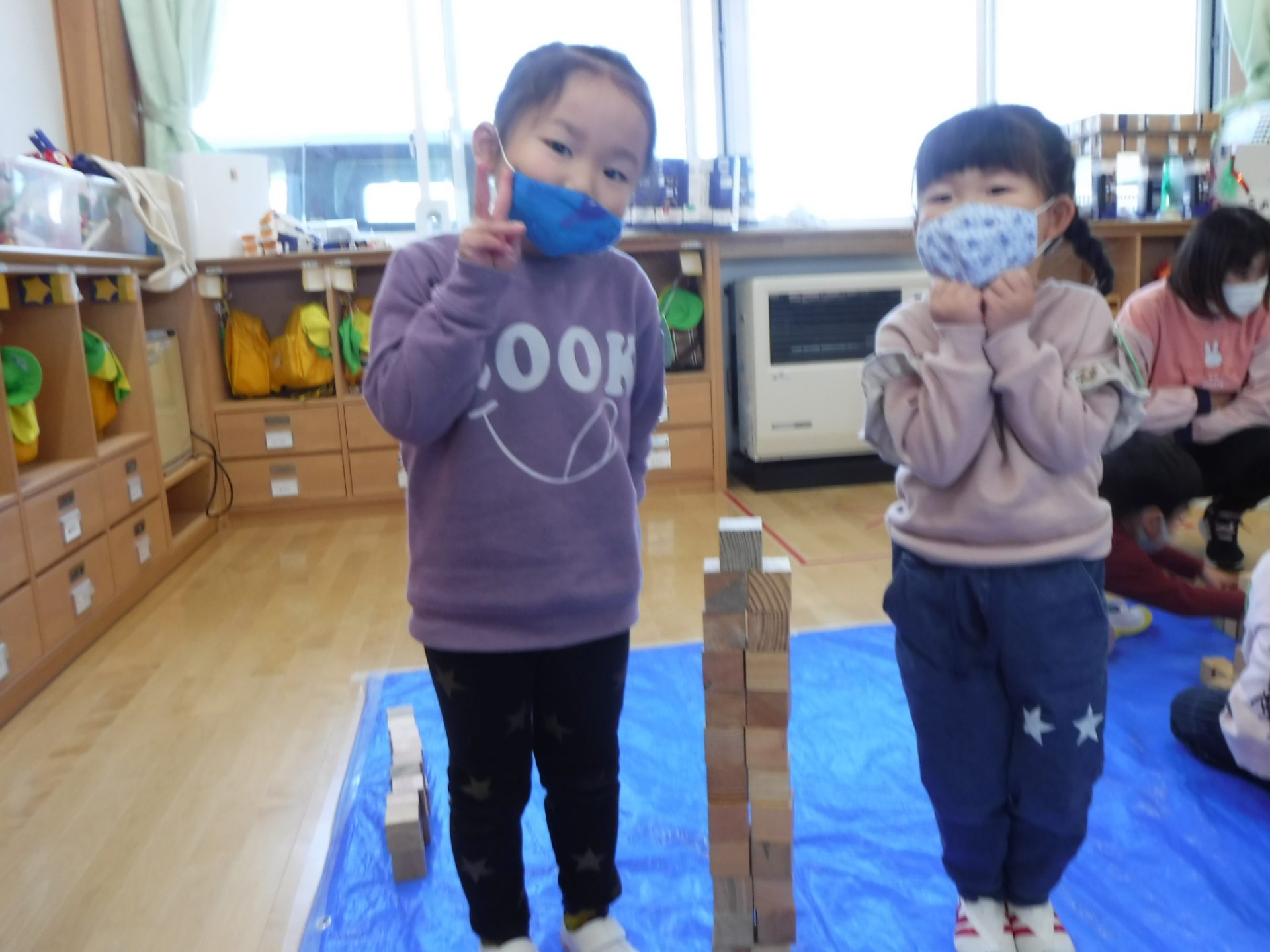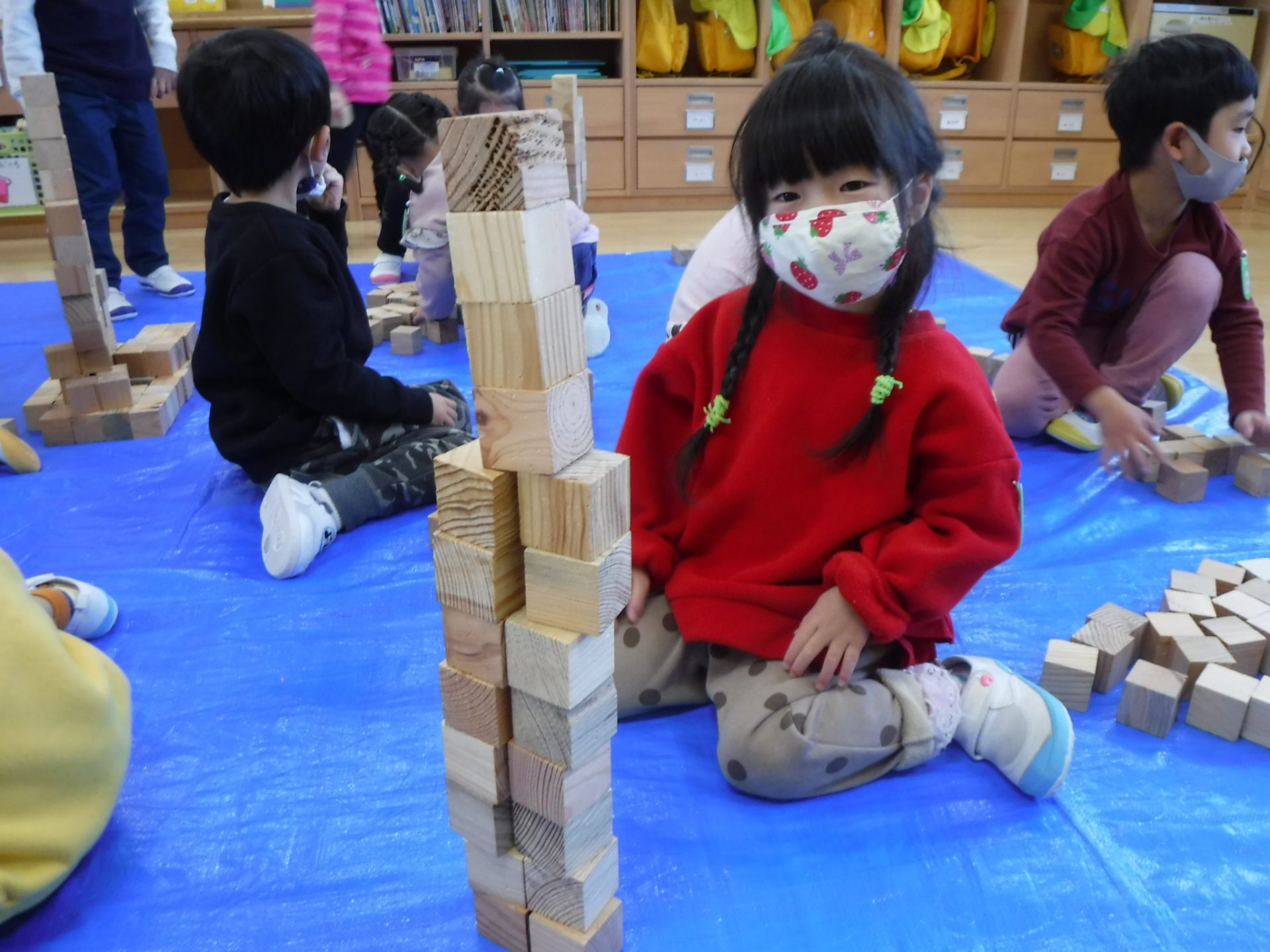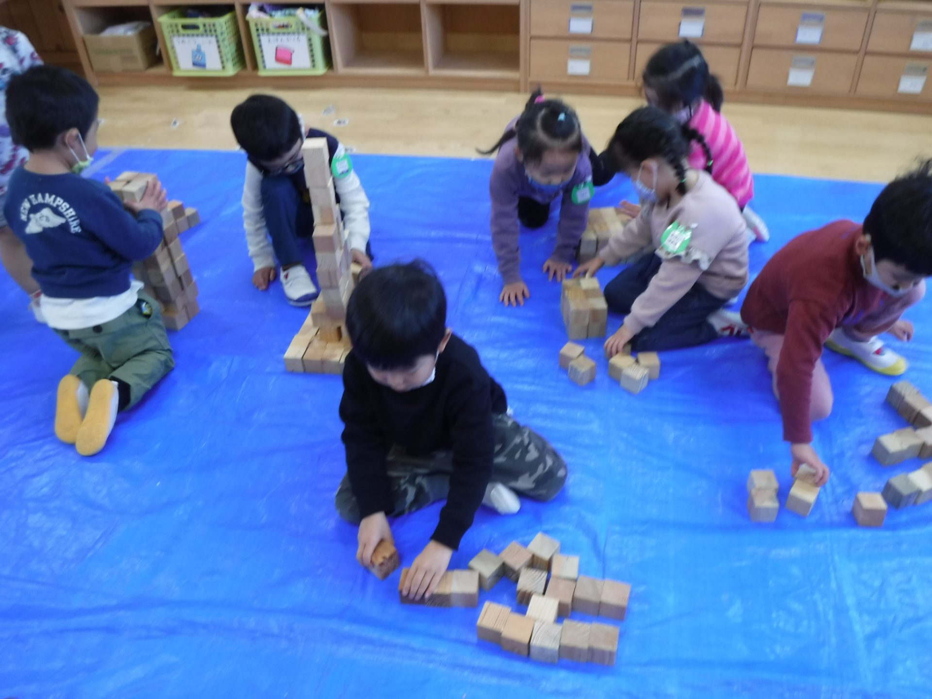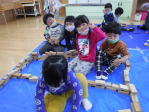 遊戯室では年中さんと年長さんで積み木遊びを楽しみましたが、年少さんはお部屋でたくさん遊びました。