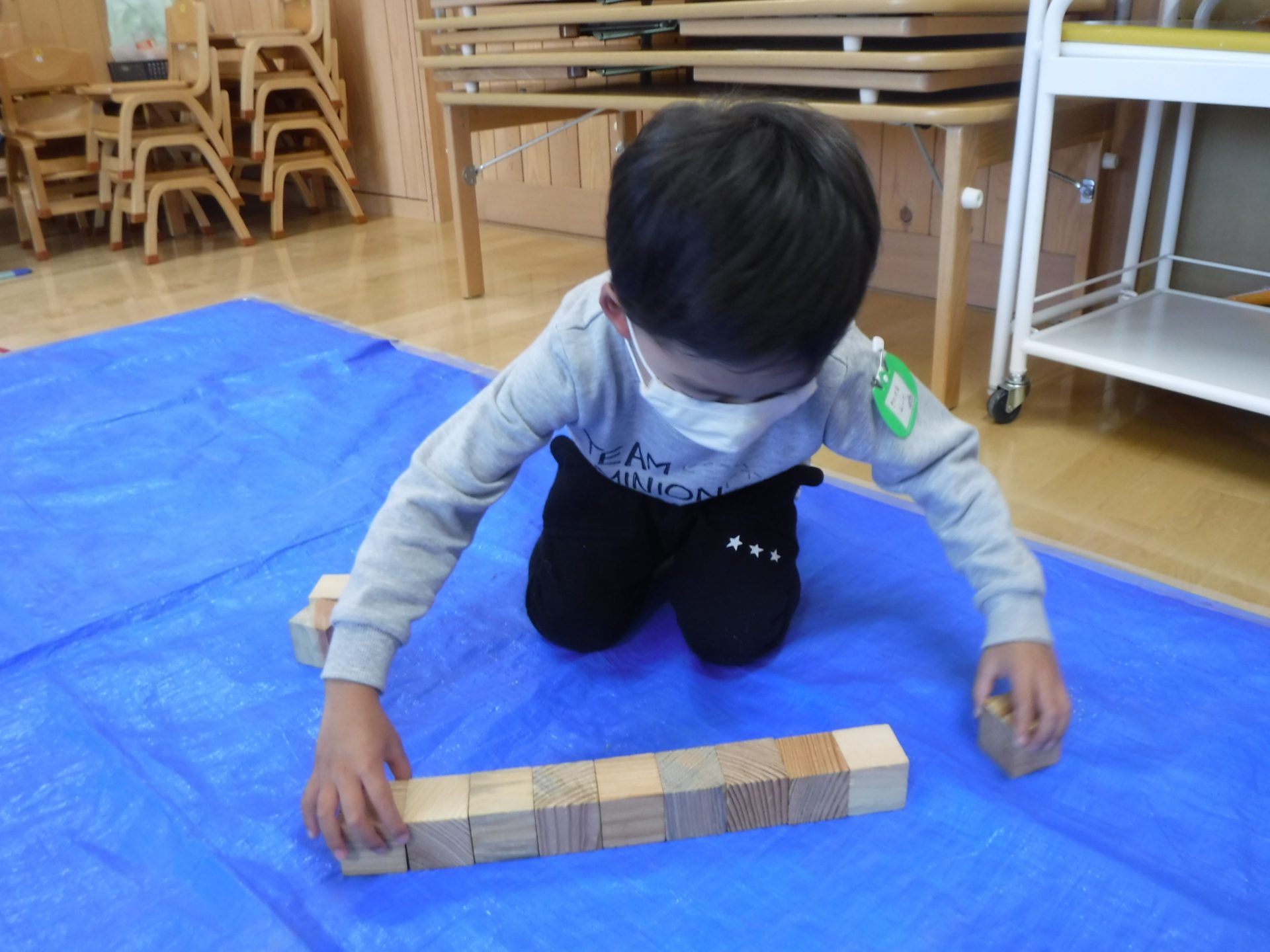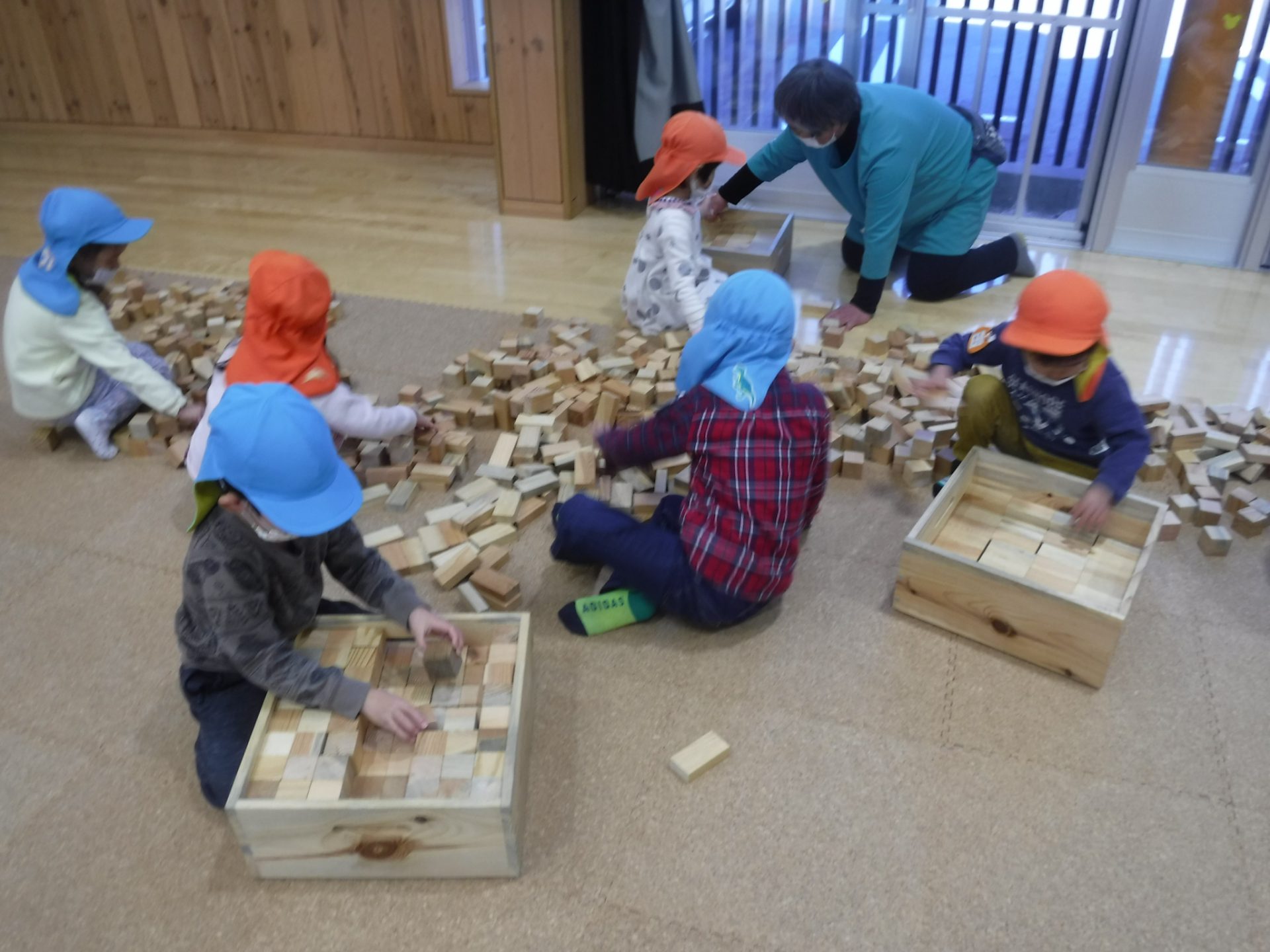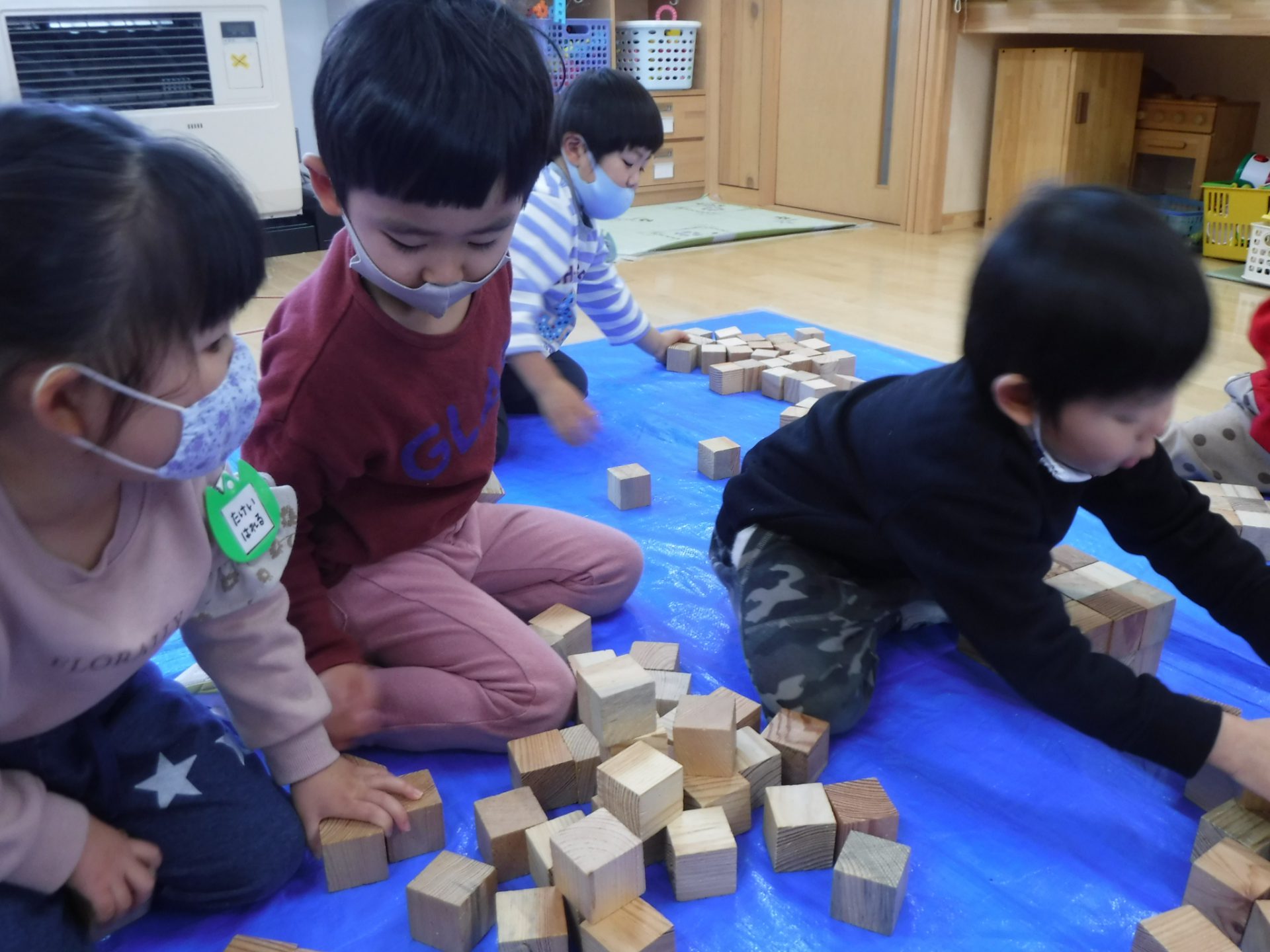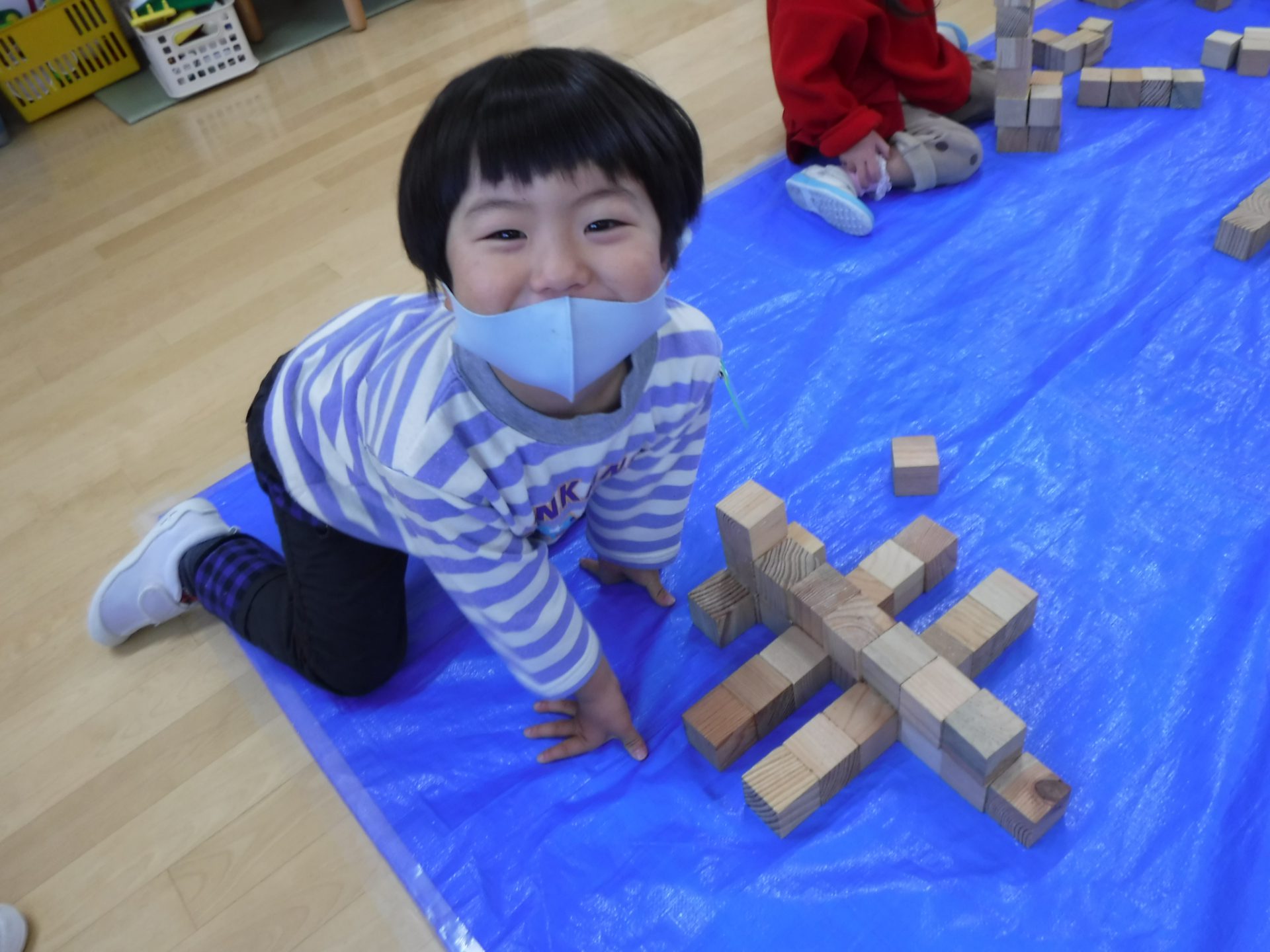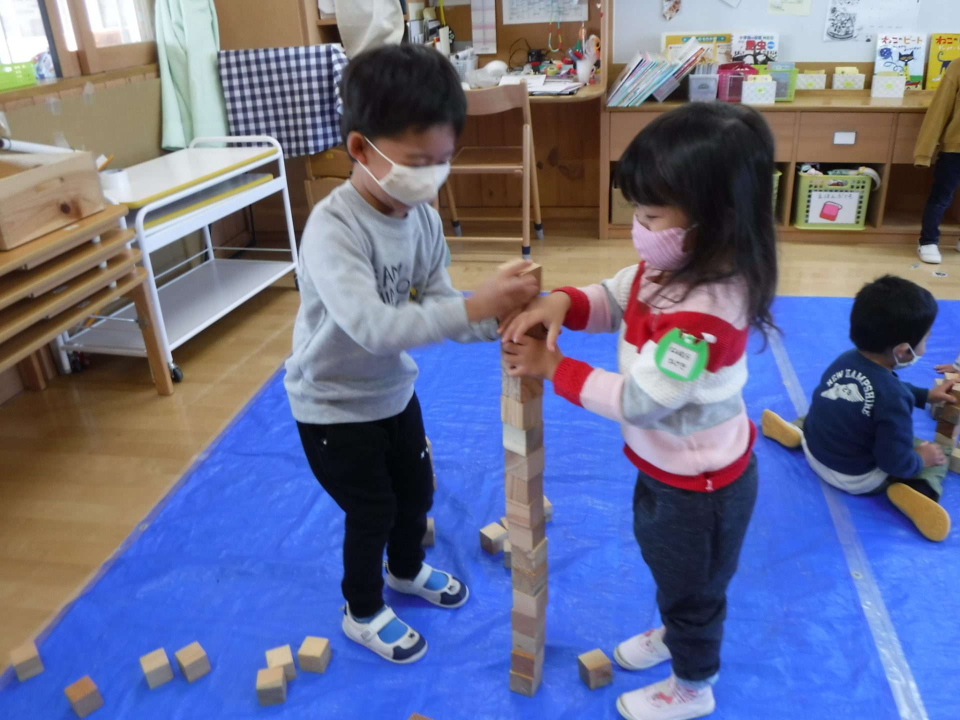 遊戯室では年中さんと年長さんで積み木遊びを楽しみましたが、年少さんはお部屋でたくさん遊びました。