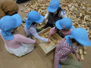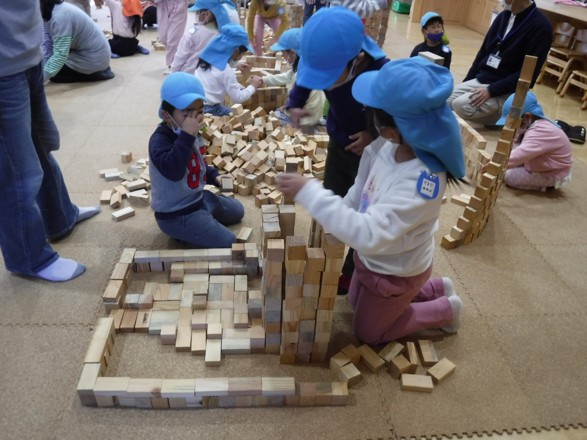 〇一万個というたくさんの積み木と積み木キャラバン隊の方々のご協力があり、一時間以上の長い時間夢中になって楽しむことができました。子どもたちは匂いや手触りなど五感を使って積み木遊びを楽しんでいました。積み木はすぐに崩れてしまいますが、それを何度も経験するうちに「もう1回やってみよう!」「崩れちゃったけど大丈夫。」と自分からチャレンジすることができるようになり、崩れては積み崩れては積みと試行錯誤して出来上がったときの子どもたちの顔は自信に満ち溢れていました。終わった後に子どもたちから真っ先に聞かれた言葉は『またやりたい!!』でした。この言葉が今日の活動の全てだったように思います。頂いた積み木を使いこれからも積み木遊びをたくさん楽しみたいです。