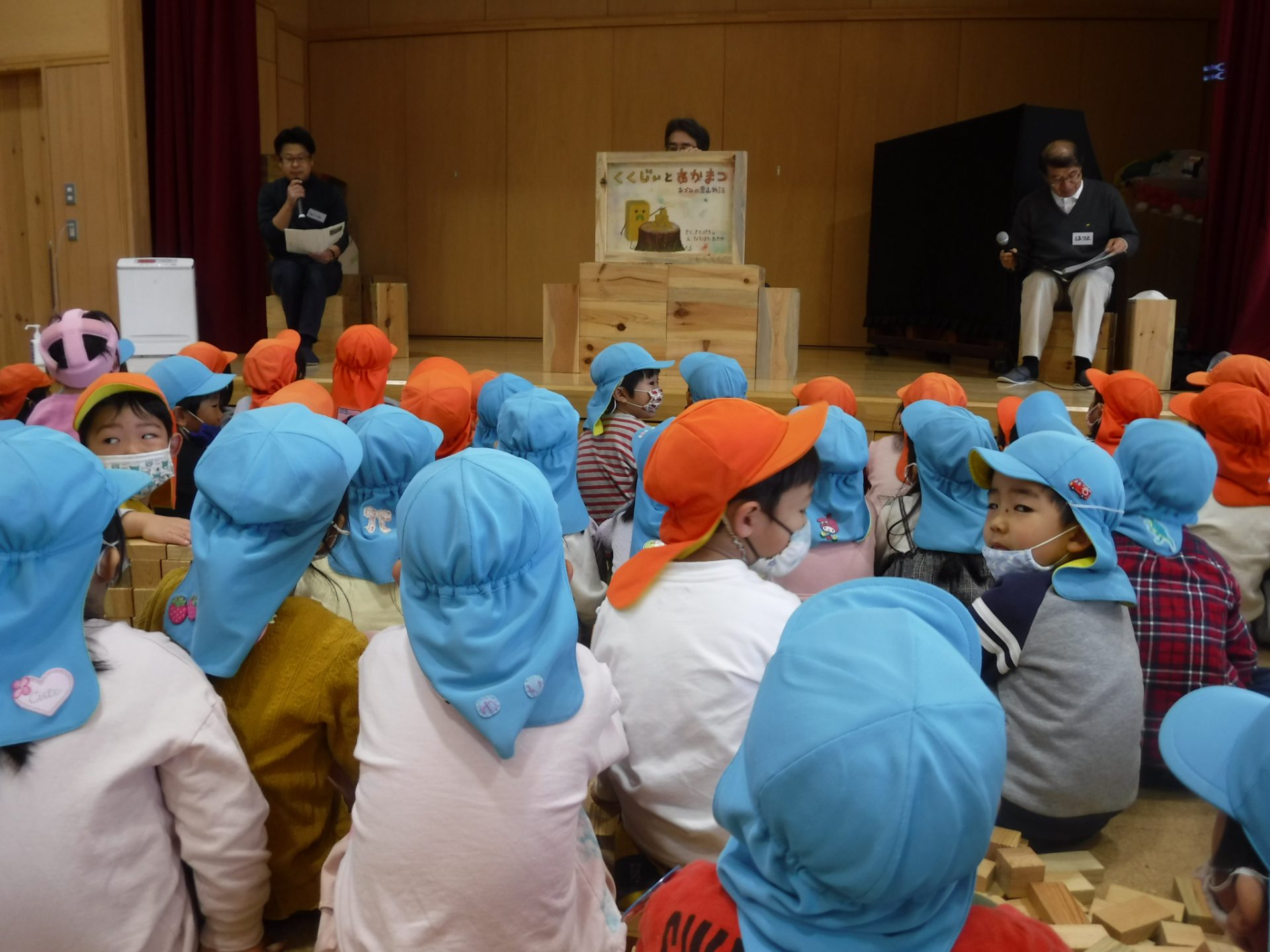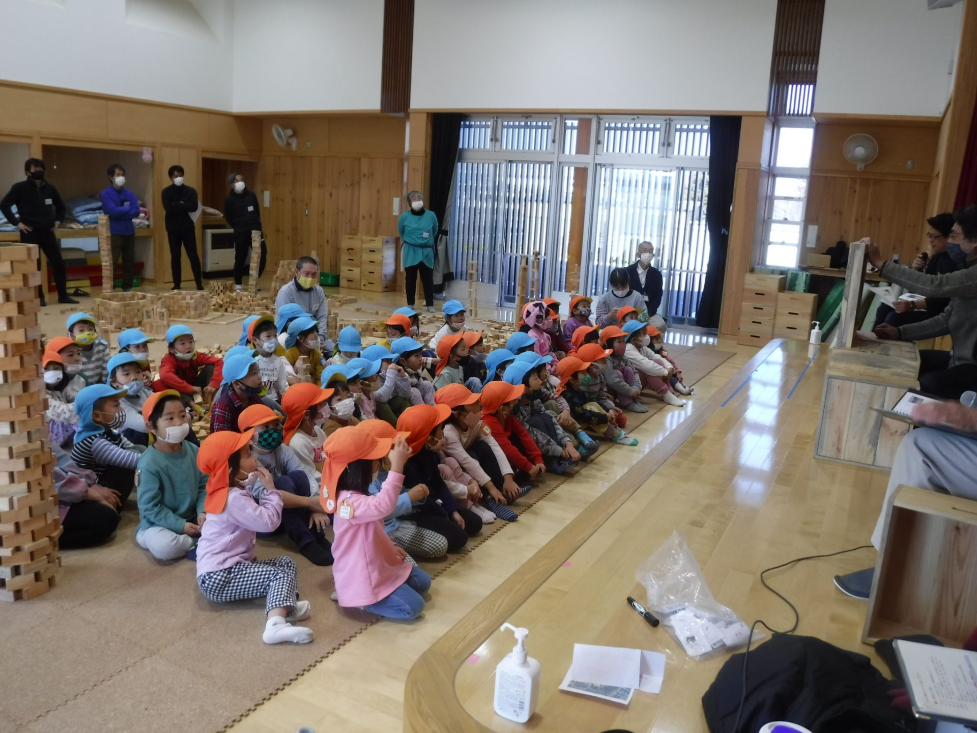 紙芝居を見た後子どもたちに「この積み木は何からできているのかな?」と聞いてみると、一斉に『あかまつ~』と答えていました。
