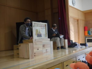 積み木に触れて楽しんだ後は、この積み木がどうやってできたのか、安曇野の自然や松枯れについて分かりやすく教えてくれる紙芝居を見ました。