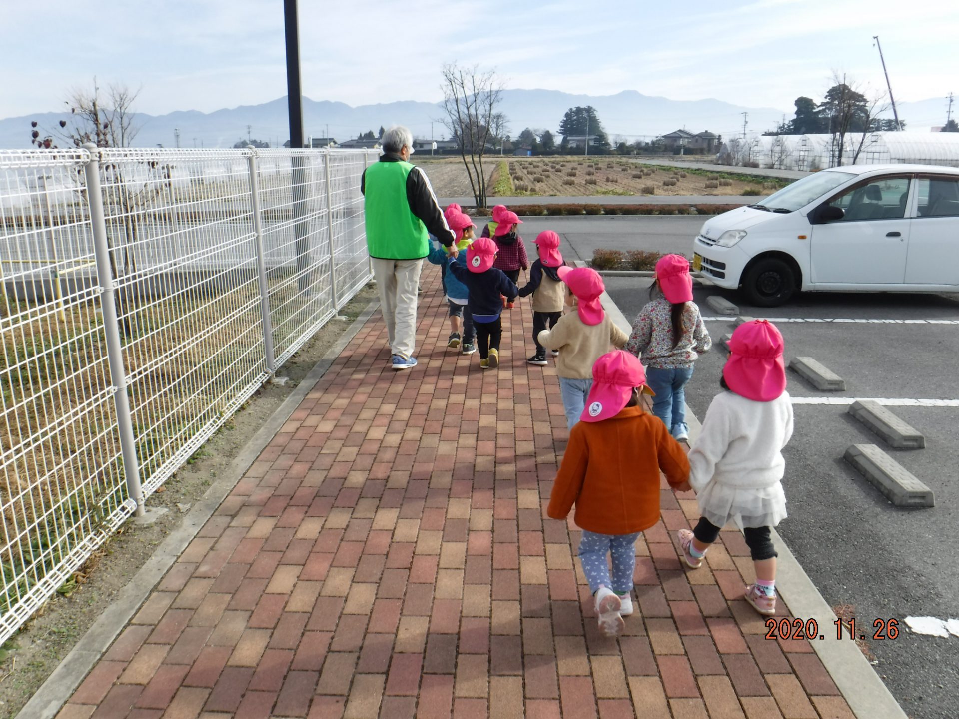 保育士や友だちと手をつないで園を出発!