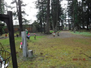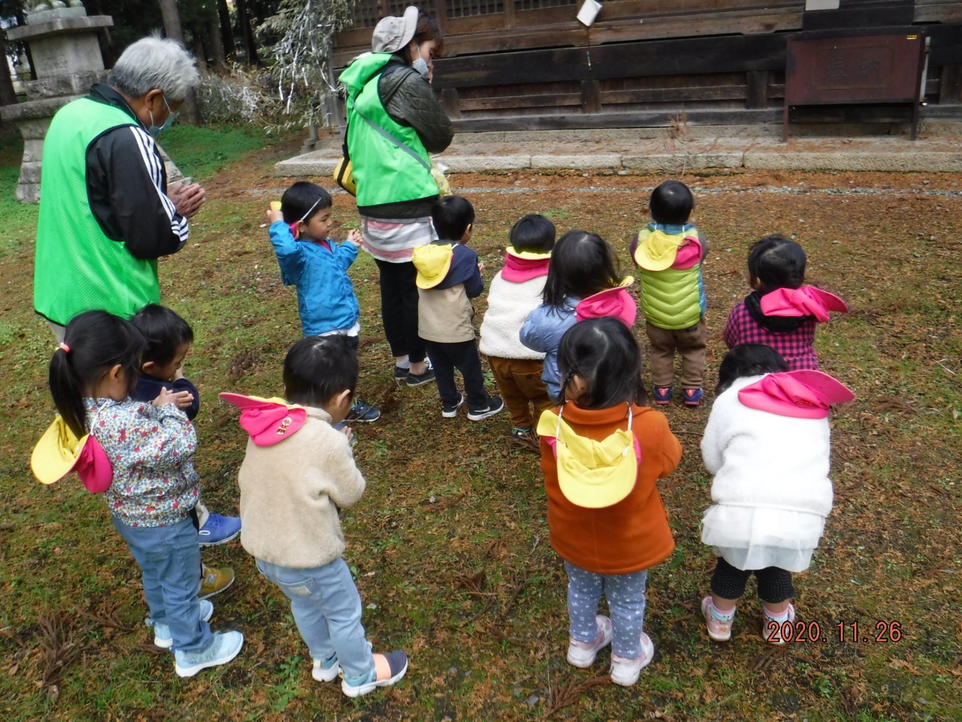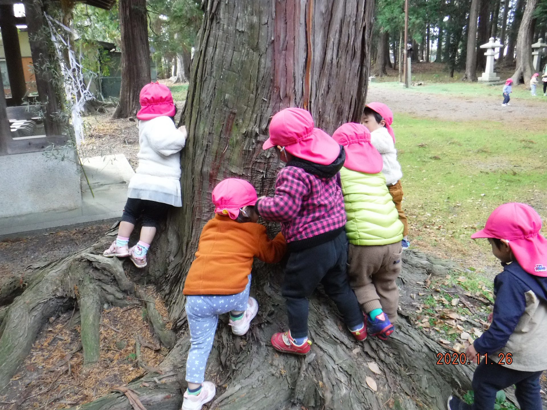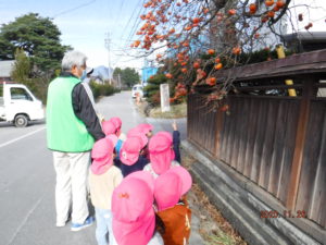 神社に向かう道中…「柿ー!」と柿の木に気づき、(その前の週と比べて)「柿がなくなってるー」「鳥が食べたのかな?「猿が食べたんじゃない?」「キリンかも」の声が。
