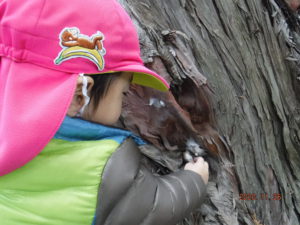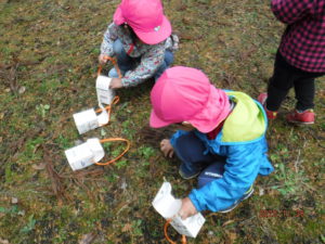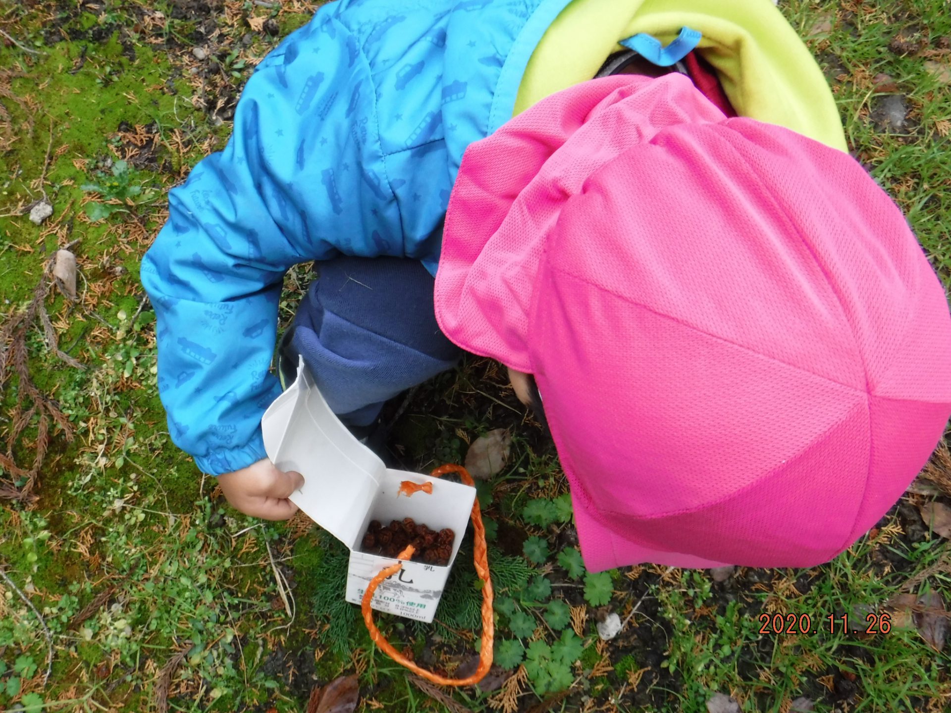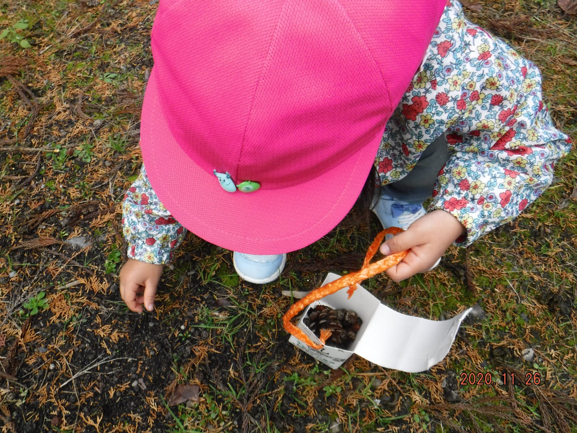 杉ぼっくり拾いに夢中になっている2人。おでかけバックが一杯になるまで拾い集め、色や大きさ、形の違いに気付き「これきれい」「赤ー」「こっちは小さいね」などと教えてくれました。