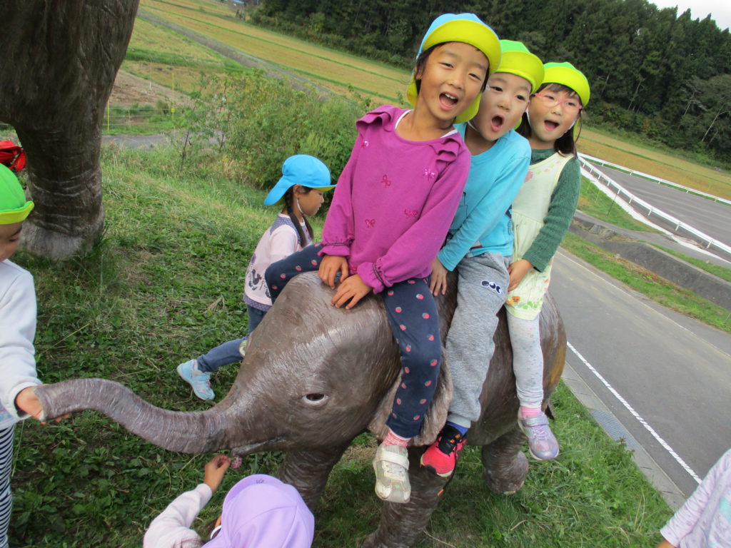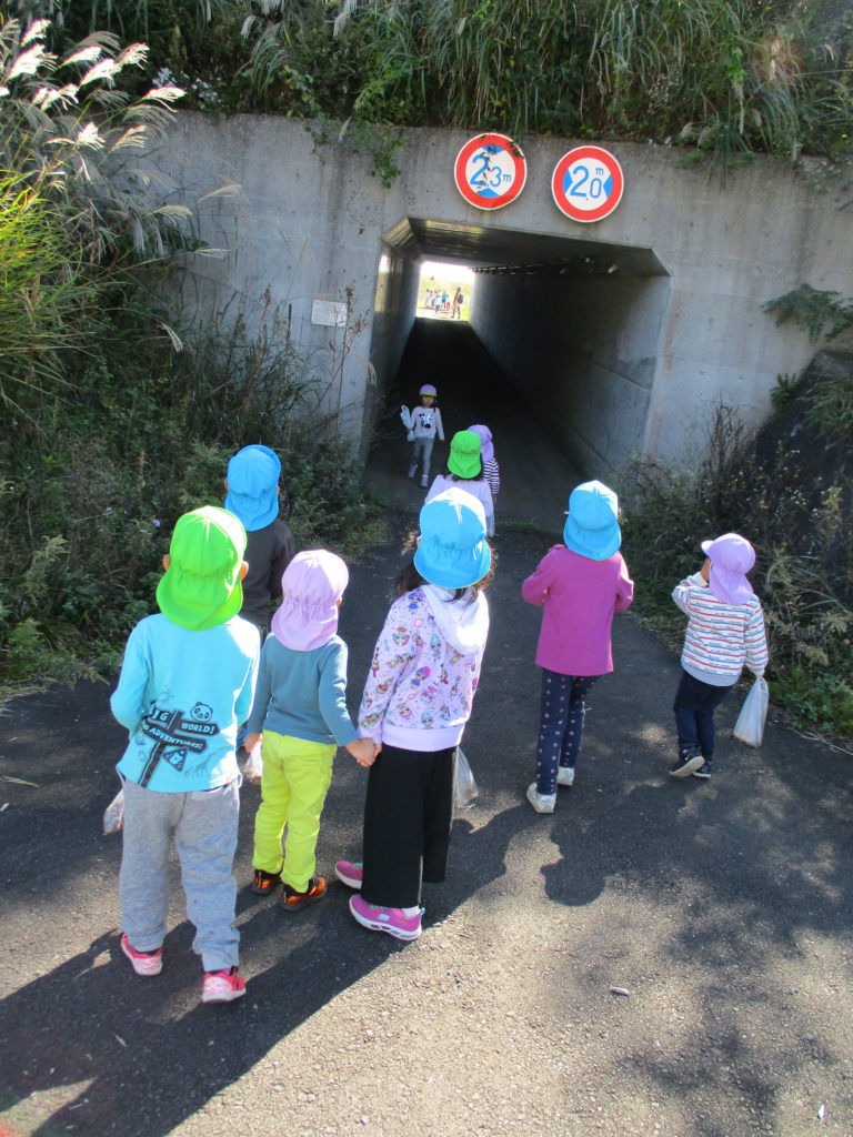また、別の日は大好きなナウマンゾウの像がある広場へ。道中も楽しみがいっぱいです。国道下を通っている声が響くトンネル。低い声を出したり、高い声をだしたりするとおばけの声みたい!「怖くないもん!一人でも平気!」と言う子がいたので「一人で通ってみる?」と聞くと「やりたい!」車が通らない道なので一人で歩いてみたい子はチャレンジ!自分で決めて2人、3人でくる子もいました。