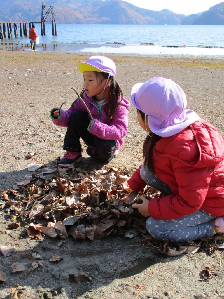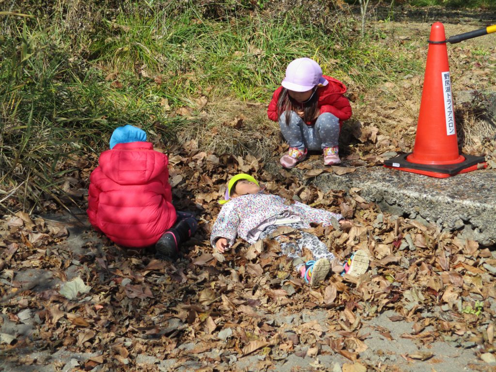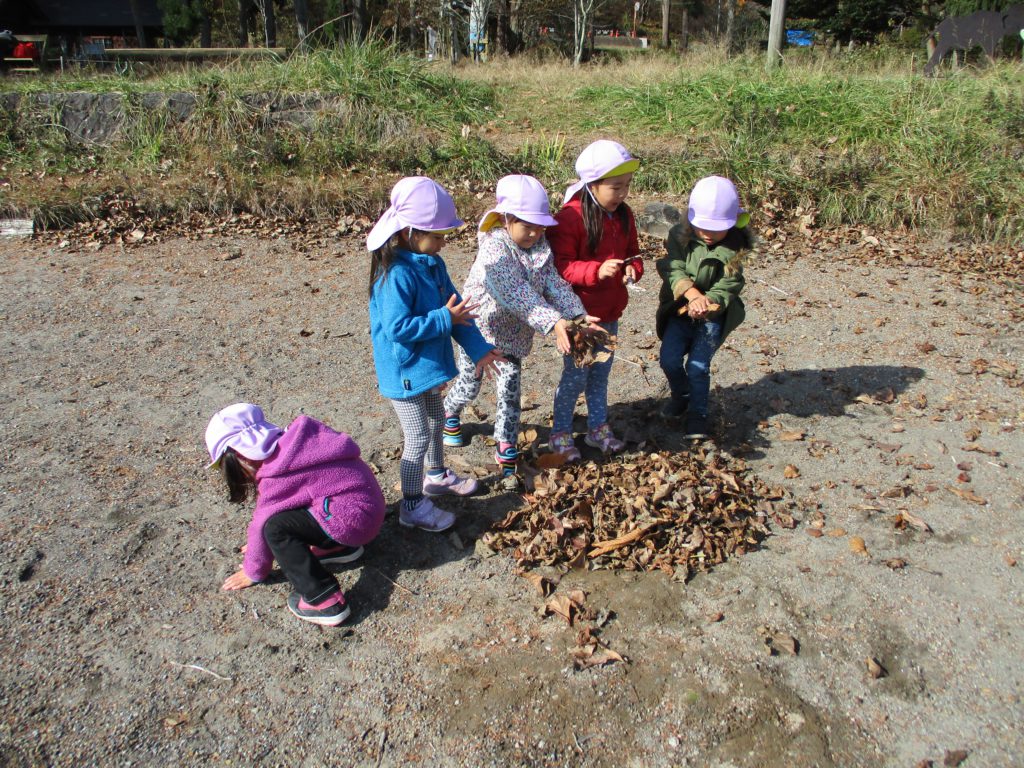 別の場所ではやきいもごっこ。全員3歳児です。ちょうど穴があいて窪んでいる場所を見つけたのでそこへ葉っぱを集めています。