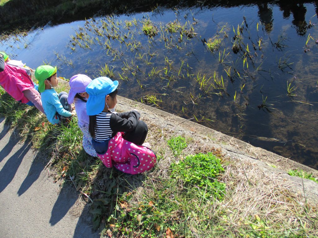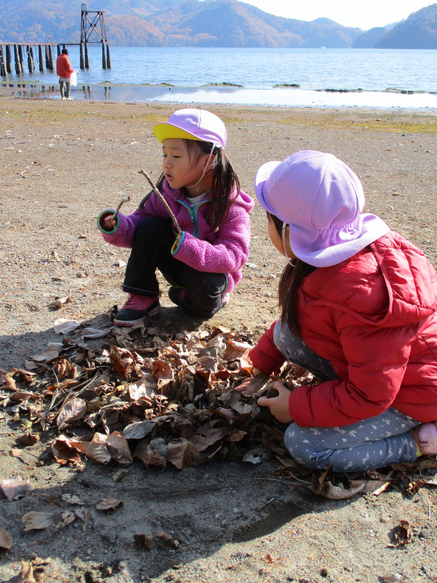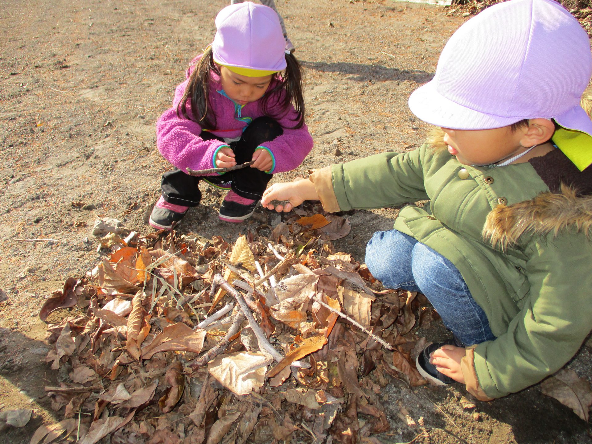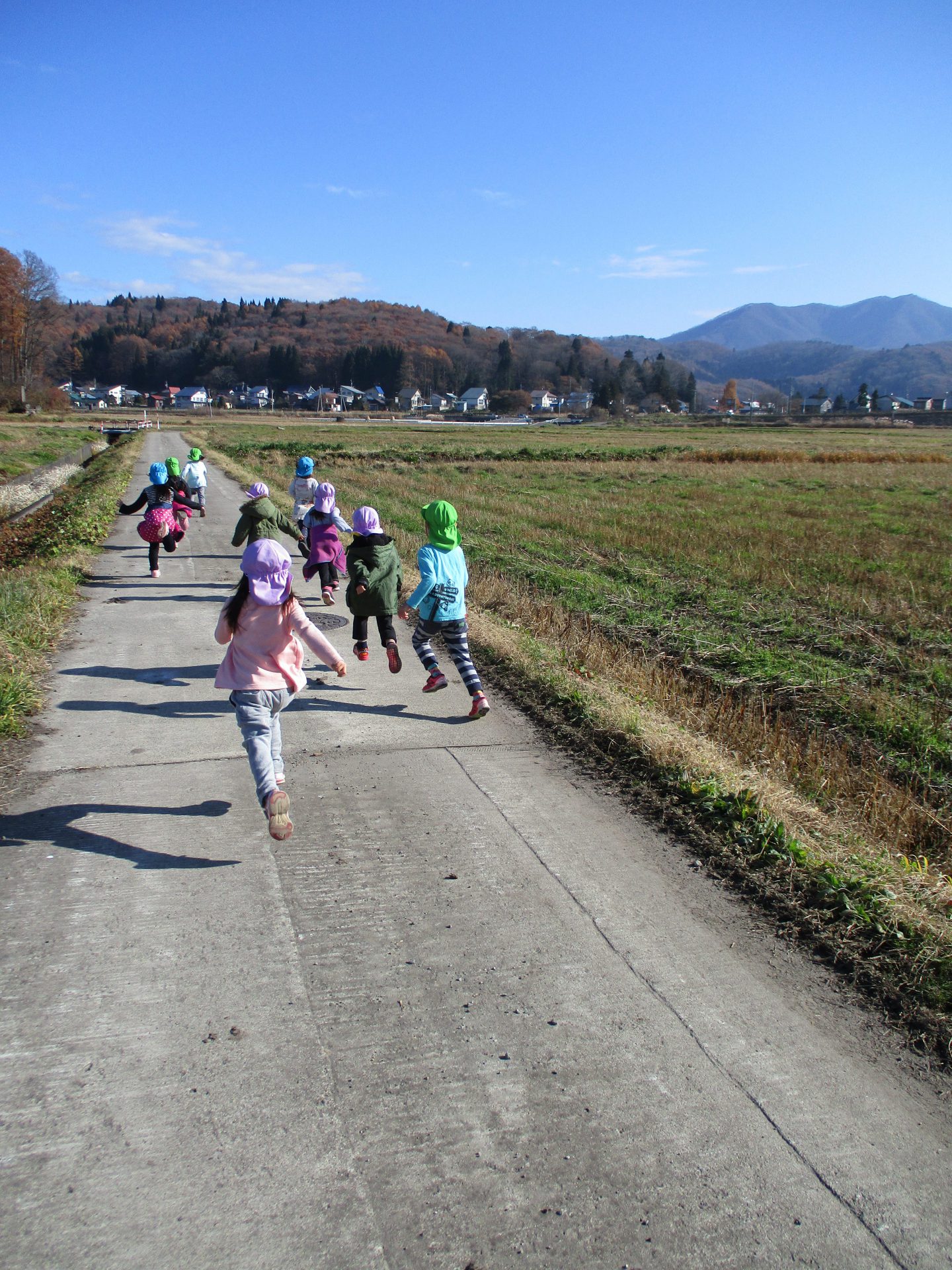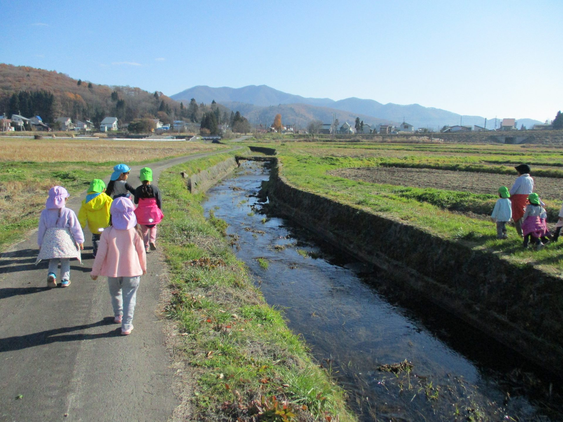 暖かい日差しの11月、たくさん散歩に出かけました。冷たい風も吹くようになり、山が白くなる様子に気付いた子どもたち。「もうこれで最後かなぁ、雪が降ったら散歩に行けないもんね。」と話していました。散歩の行き先も相談して決めています。でも行きたい場所は分かれてしまうこともあります。「どうしようか?」と聞くと、「今日は○○、明日は△△がいいんじゃない?」「でも今日はやきいもごっこがしたいから△△がいい!」話し合いの機会を大切にしてきたので、理由を伝えて話をすることができるようになってきました。まだまだ仲立ちは必要ですが、話し合って相手の気持ちに気付くきっかけにしていきたいと思います。