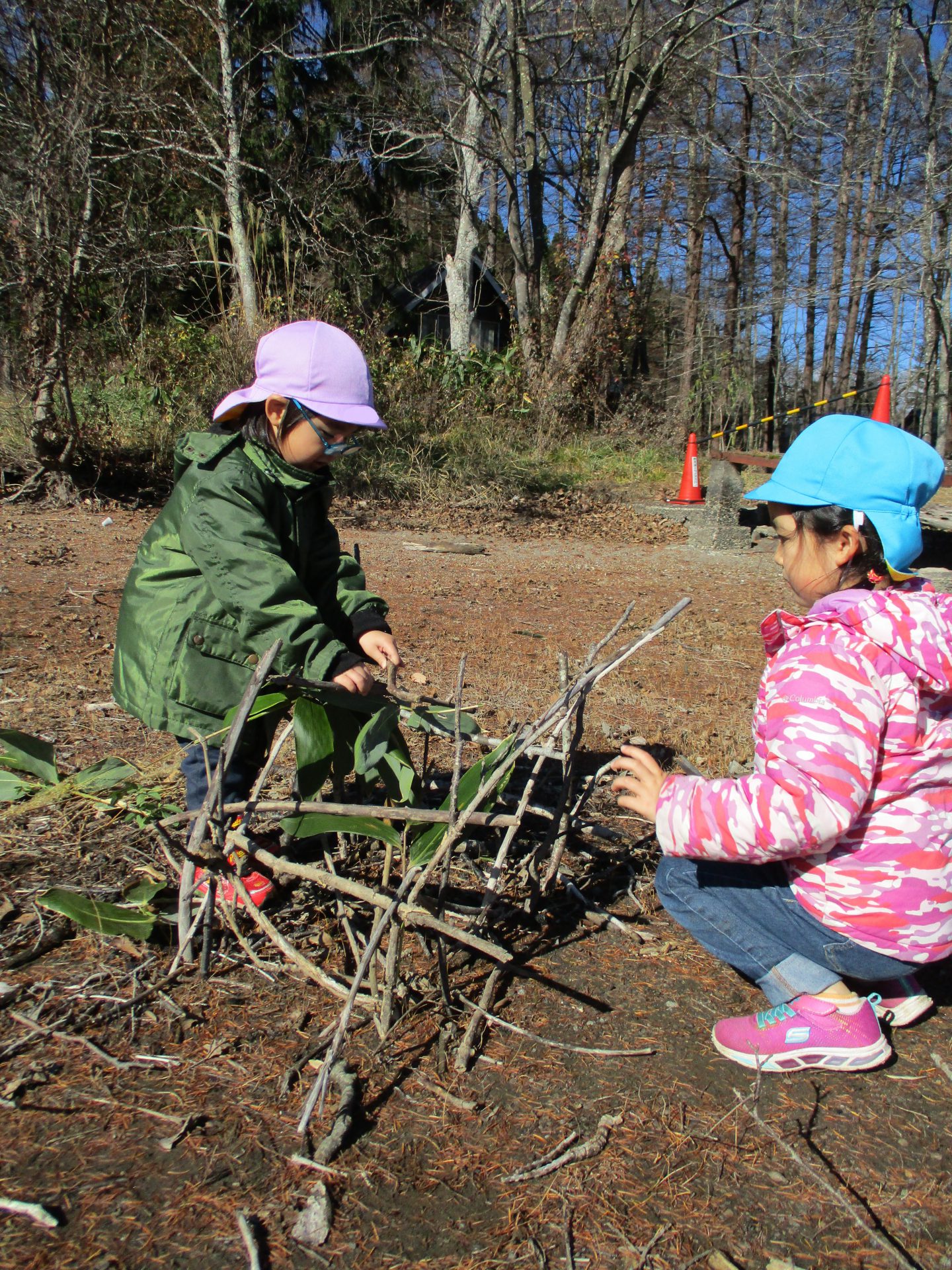 「葉っぱを屋根にする?」枝と枝を渡して屋根にしようとしますが短くて届きません。「もっと大きいのじゃないと…」「先生!大きい笹の葉とって!」