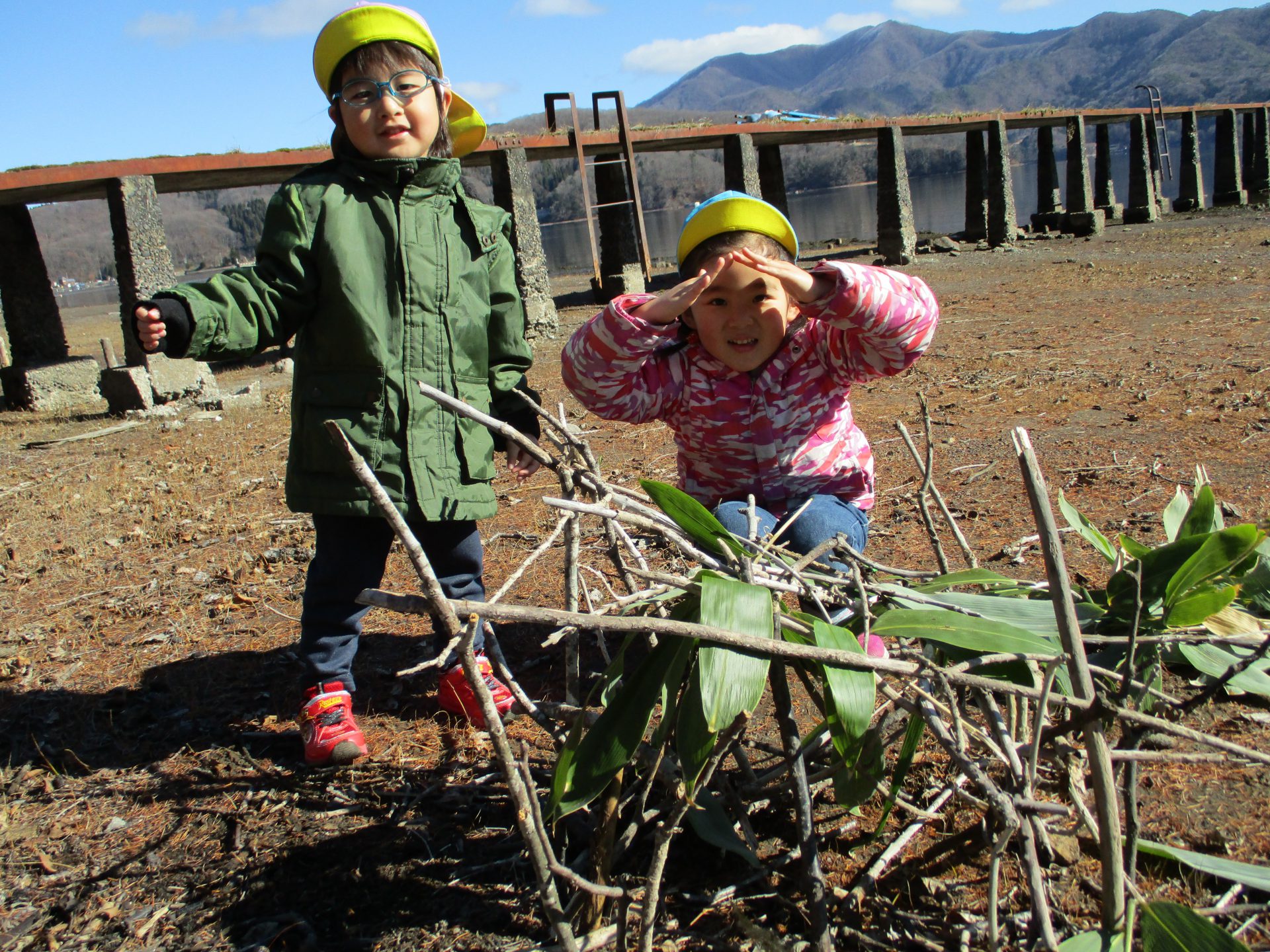 さてこの日は湖の近くのいつもの公園。3歳と5歳のコンビで家作りを始めました。湖の水が引いて流木がたくさん転がっています。