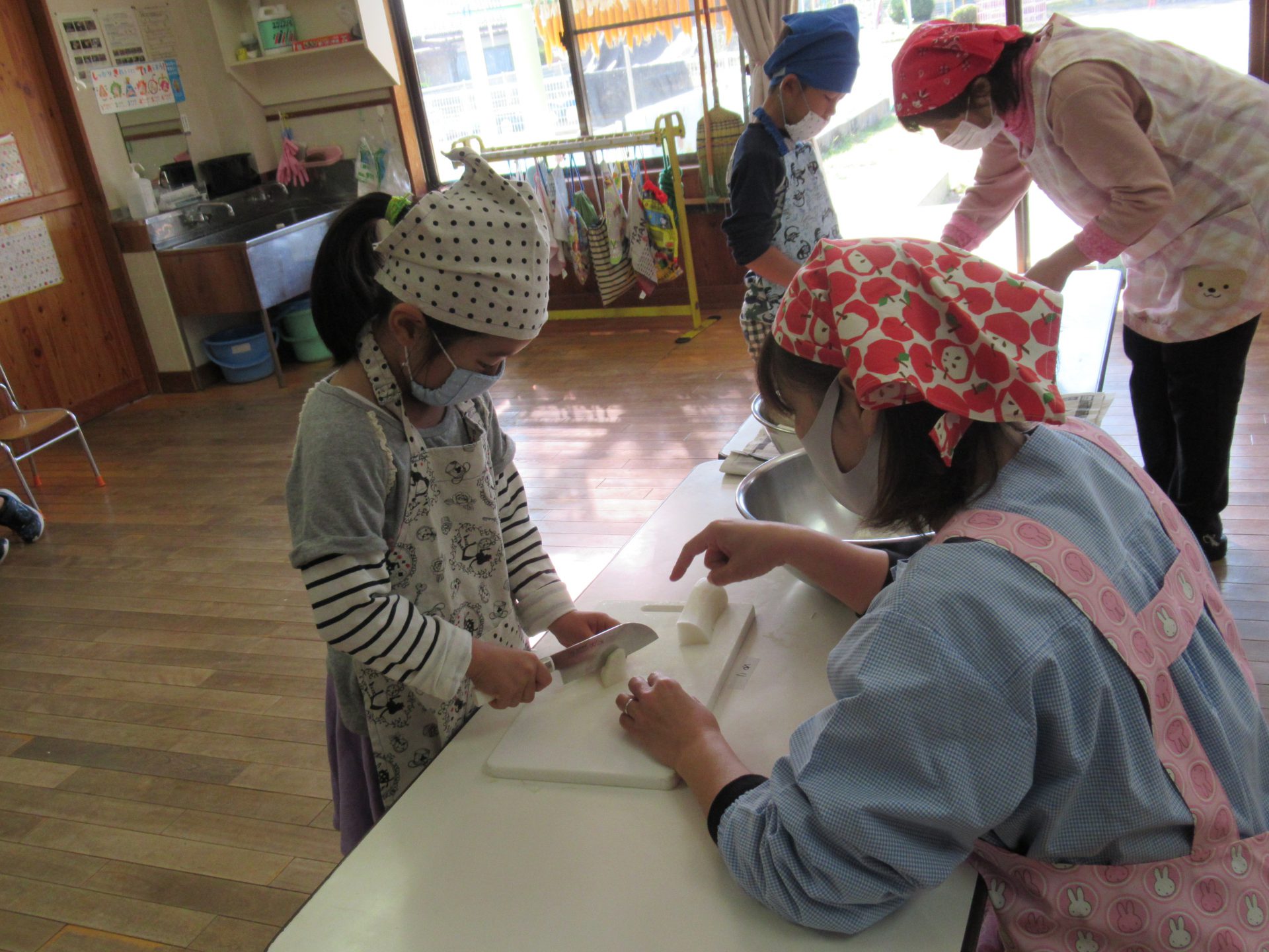おでん会では各学年で分担して、おでんの材料をちぎったり、切ったりの