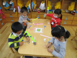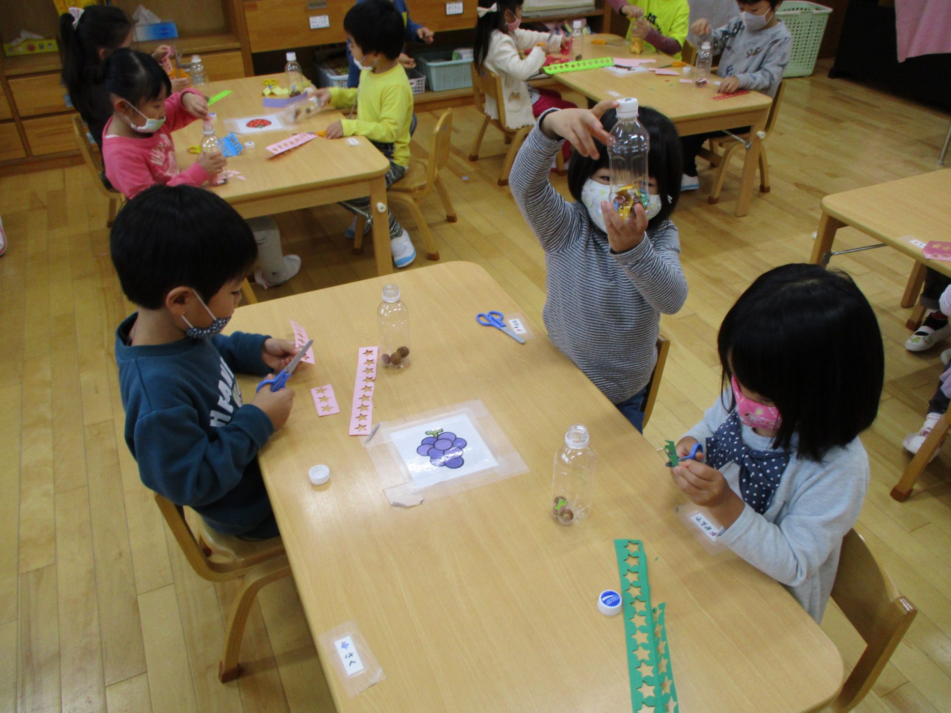 ペットボトルに入るか入らないか何回か出し入れして、自分たちで考えながらマラカスを作っていました。どんぐりを入れる数によって音が少し変わることも友だち同士で比べて楽しんでいました。