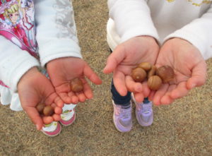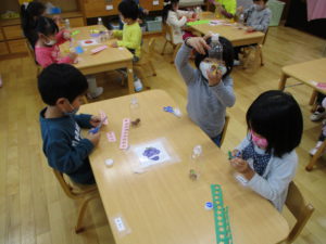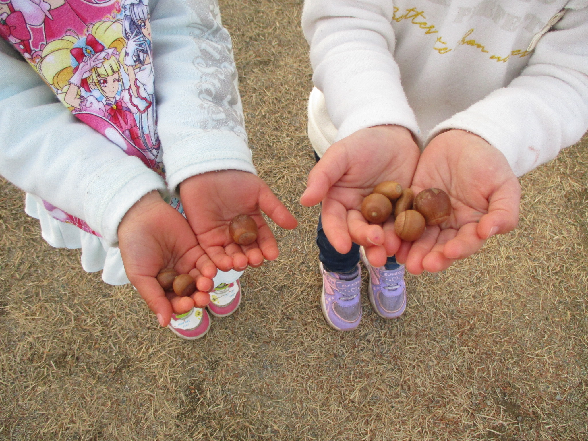 今回も、自然物一つから、マラカス作りになり、そこから音楽会ごっこへとあそびがどんどん広がっていきました。今はどんぐりごまをしたり、お店屋さんごっこの品物作りを楽しむ姿も見られます。