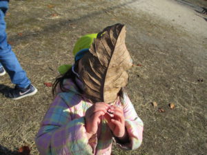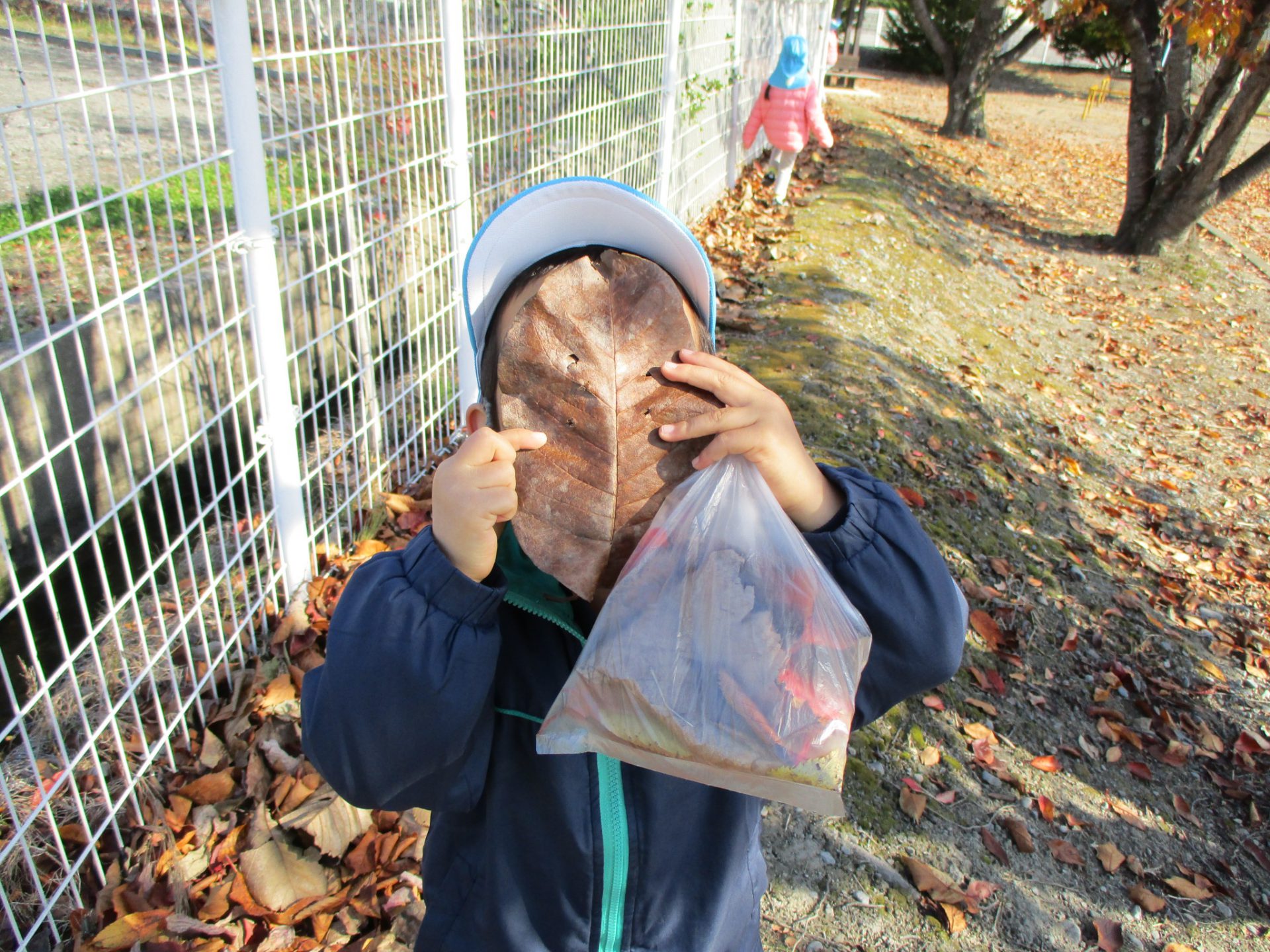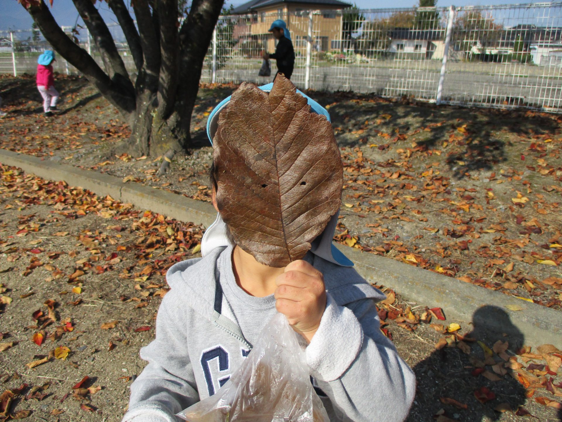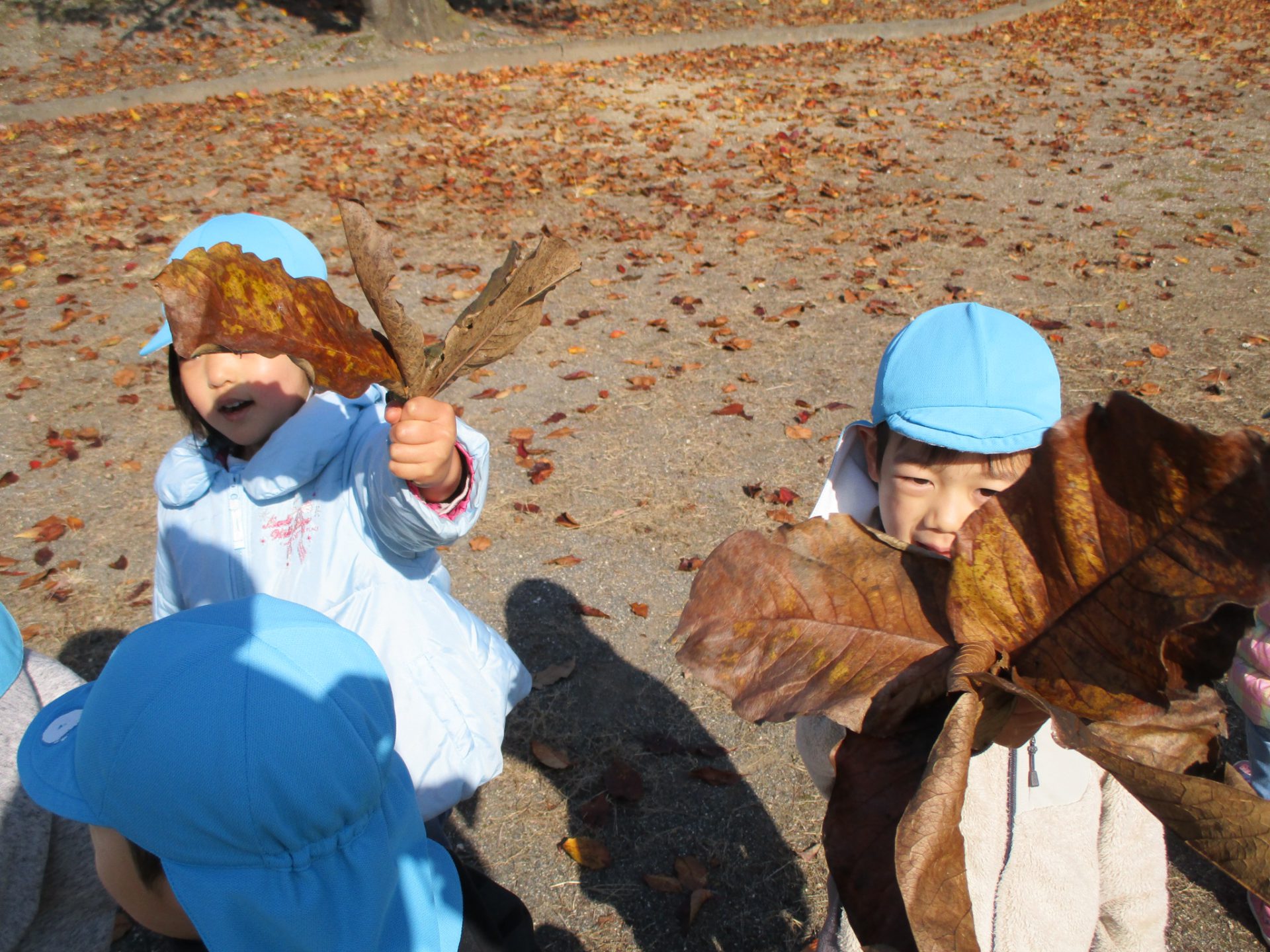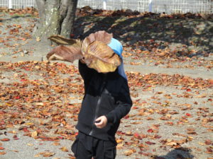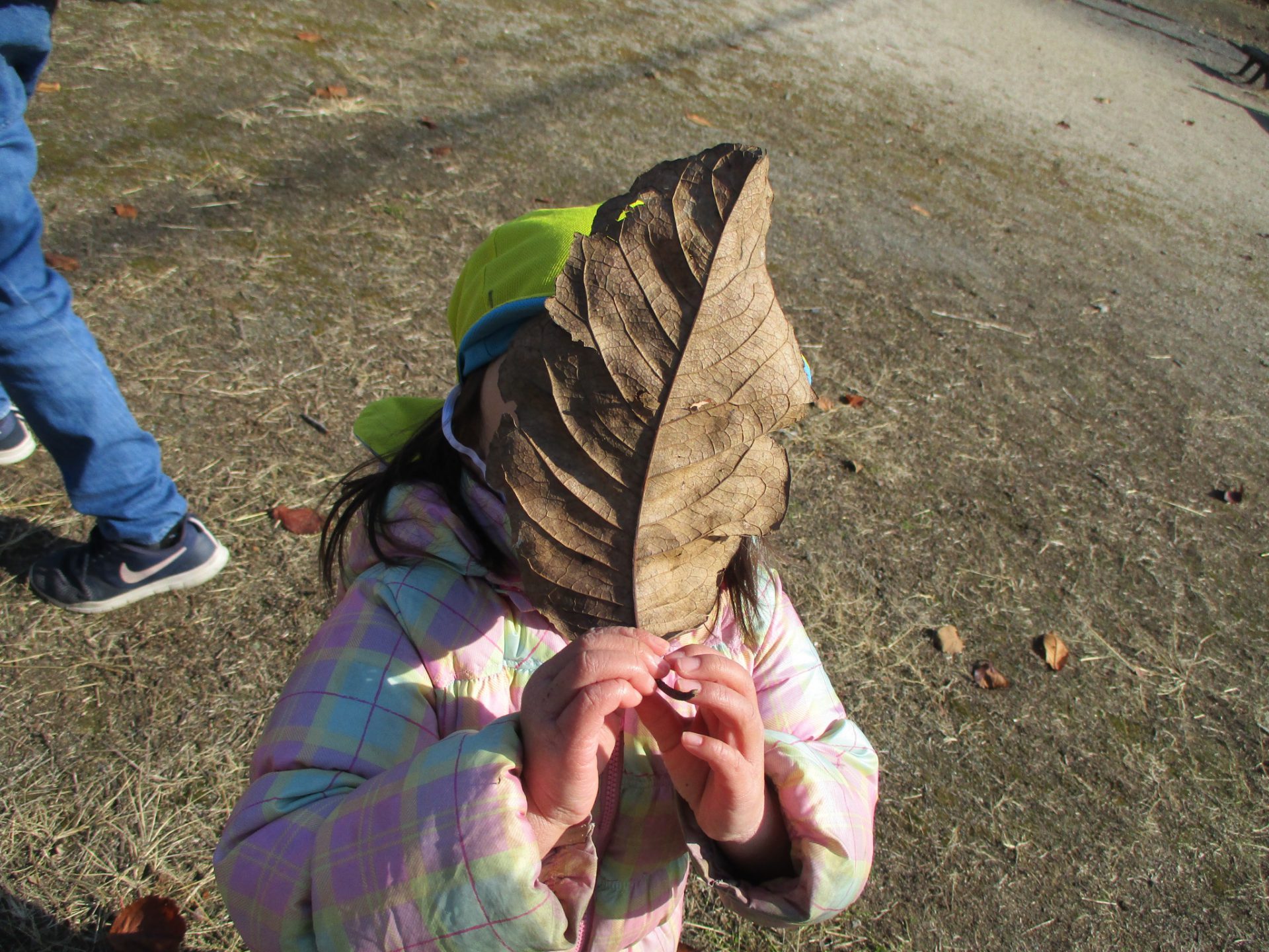 また近くの公園に行った時には大きな葉っぱを見つけてお面にして楽しんでいました。