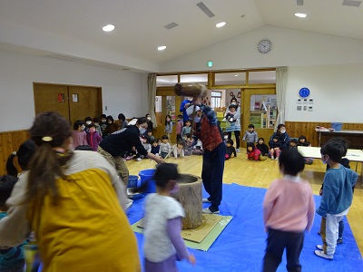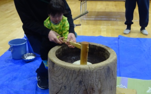 二人一組で杵をもち「せーの」と声を合わせてもちつきをします。周りのお友だちが「よいしょ!よいしょ!」と応援してくれて、力も入り、杵を高く上げでがんばっていました。