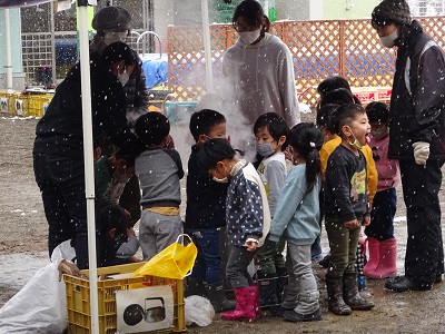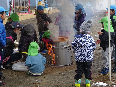 園庭でかまどに火がはいると、早速周りに集まり、興味津々の子どもたち。「あったかーい!」と温まっていたり、「もうできたの?」と聞いたりして、もちつきを楽しみにしています。