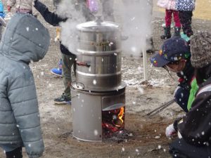 「いいにおいがする」「もう食べられるの?」とかまどを見に来る子どもたち。教えられなくても、敏感に感じ取っていました。大人は時間で考えていたけれど、子どもたちは直感力が鋭いです!!