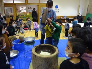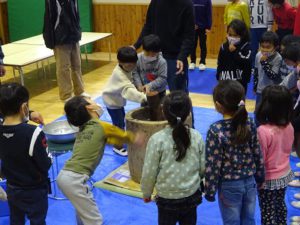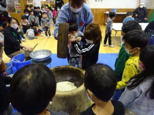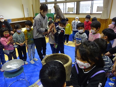 まずは見てみよう!地域の方の力強いもちつきにみんな「うわぁ すごい」と大喜びで、“自分でもやってみたい”気持ちが一層高まった様子でした。