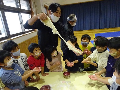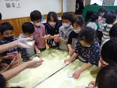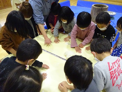 実際に行ってみることで、子どもも大人もいろいろな気づきがあり、驚いたり感動したりしながら鏡餅づくりの経験ができた様子です。